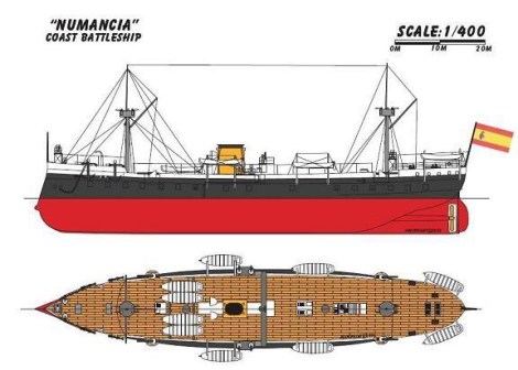 Acorazado Numancia, ejemplo típico de navío acorazado de la década de 1860. Inicialmente armado con 40 cañones lisos de 68 libras, fue clasificado como fragata acorazada. Su casco de hierro estaba protegido por una coraza del mismo material de un máximo de 13cm de espesor