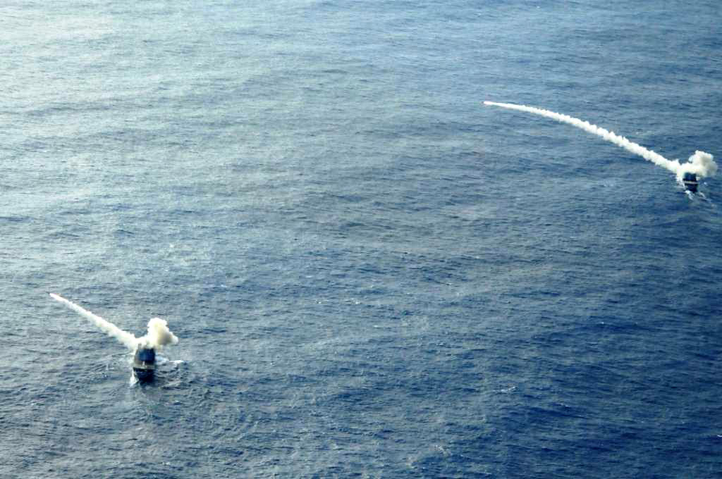 En la foto se puede observar la corrdinación del tiro de ambas naves. Este tipo de lanzamientos permite asegurar una saturacióna decuada de misiles para atacar blancos bien defendidos.