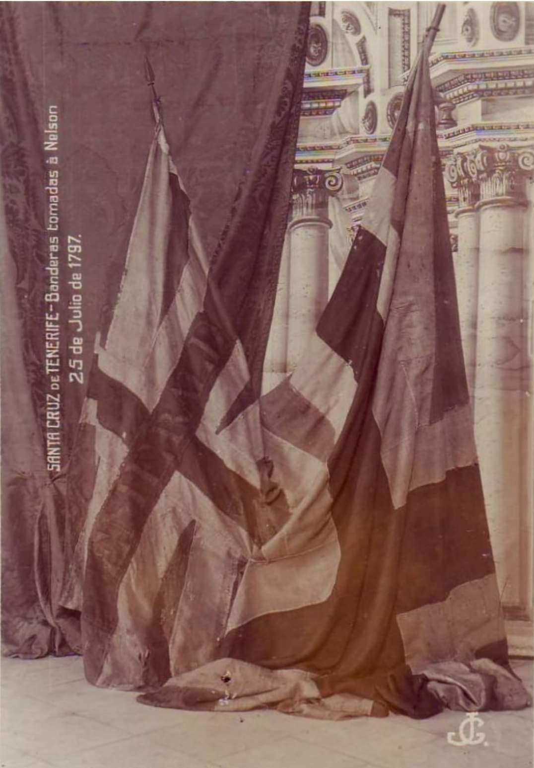 Postal de principios del pasado siglo XX mostrando una instantanea de dos de las banderas británicas capturadas a la escuadra de Nelson tras ser derrotado en la batalla de Tenerife en 1797. Aquí se muestran expuestas y parcialmente desplegadas en la iglesia tinerfeña de Santo Domingo las pertenecientes al navío de 74 cañones HMS Theseus y a la fragata de 36 cañones HMS Emerald (FOTO: José García)