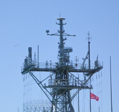 Tope del mástil principal mostrando la característica antena del radar de designación del blancos RAN-30 y la bandera conmemorativa del V Centenario de la primera vuelta al mundo (Foto: Gorka L Martínez Mezo)