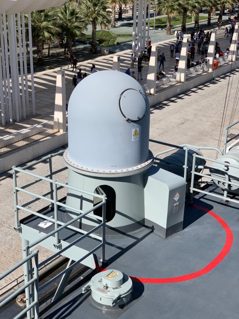 Domo de la dirección de tiro Mk92 Mod 2 instalado sobre el techo del puente. Es capaz de manejar dos blancos al mismo tiempo, tanto superficie-superficie como superficie-aire. Se pueden observar los servos amortiguadores en su peana o base. (Foto: JuanCris Ortiz)