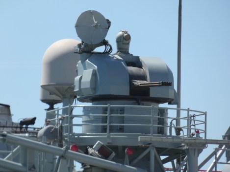 Montaje Meroka. Compuesto por 12 tubos de 20/120mm que dispararan “perdigonadas” a una cadencia de tiro máxima teórica de 7200dpm, está controlado por un radar telemétrico VPS-2 y una cámara diurna/nocturna ENOSA montados ambos sobre el techo del montaje. Dispone de varios medios de control incluyendo uno completamente manual desde la cosonla Meroka del CIC que permite su uso contra embarcaciones (Foto: Gorka L Martínez Mezo)