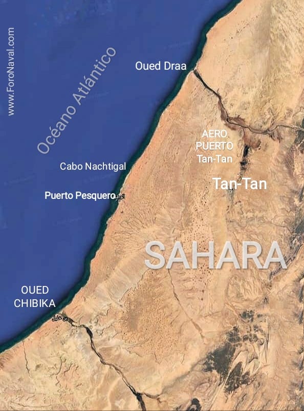Además, según nos comenta nuestro amigo Álvaro Mediavilla, mecánico y marino profesional que conoce muy buen las aguas del Sáhara marroquí, se trata de una extensa y desértica costa, con muchos bajos y bancos de arena que se mueven a merced de las corrientes, así como zonas rocosas que están trufadas de pecios embarrancados alertando del peligro, donde para acceder a los puertos hay que maniobrar muy bien por los canales, que son los accesos utilizados por los pescadores locales, siendo practicables casi unicamente con marea alta para entrar y salir, por lo que es recomendable maniobrar de día y fondear de noche para no arriesgar en la navegación.