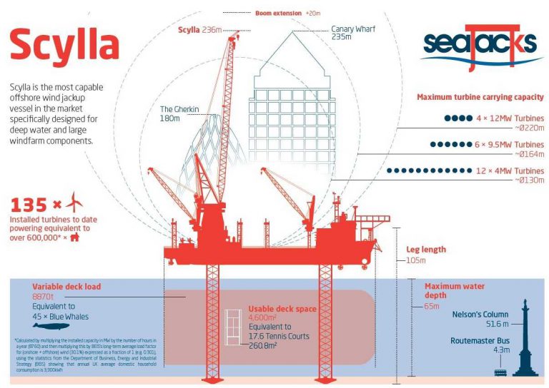La longitud de cada una de sus cuatro patas es de 105 metros lo que le permite instalar componentes de los molinos eólicos hasta una profundidad de 65 metros.