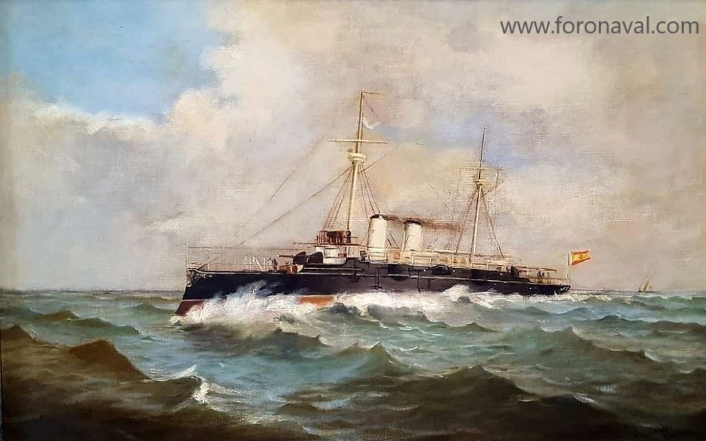 El buque fue construido en 1886 por encargo del Gobierno de España en los astilleros escoceses de James & George Thompson en Clydebank. Con un desplazamiento de 4.600 toneladas, el casco, de 97,3 metros de eslora, 15,4 de manga y 6 de calado estaba construido en acero dulce, estando dotado de un blindaje que oscilaba entre los 50 mm y los 125 mm en sus partes más vitales. Para la propulsión se instalaron dos máquinas Thompson horizontales de triple expansión acopladas a dos hélices de bronce, con las que podía alcanzar una velocidad de 20 nudos con 11.598 CV. de potencia y una autonomía de unas 12.000 millas.