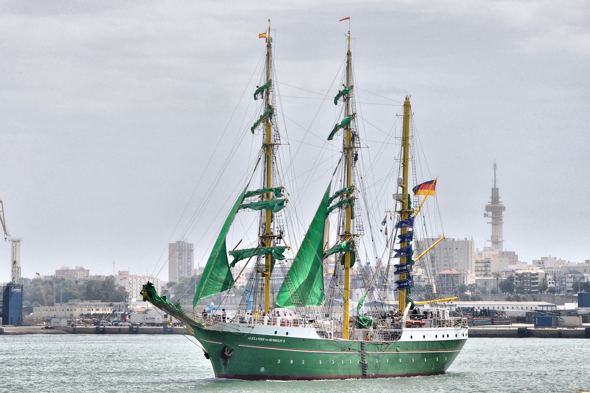 Por otra parte, la Deutsche Stiftung Sail Training tuvo el acierto y la sensibilidad histórica de llamar a su nuevo buque Alexander von Humbolt, en recuerdo del gran naturalista e incansable viajero alemán, al mismo tiempo que le pintó el casco de color verde en homenaje de la histórica naviera alemana Rickmers shipping company de Bremen, que pintaba a sus grandes buques cabohorneros con el mismo color verde corporativo. Además, la fundación logró como patrocinador a la compañía cervecera Beck´s, por lo que tiñó también de color verde sus velas como maniobra publicitaria en honor de su benefactor. Sobre las velas hay que señalar que fueron tejidas por la empresa Hinsch und Ruhland, con sede en Glücktadt, que son de los últimos fabricantes de velas para grandes veleros de velas cuadras que quedan aún en activo.