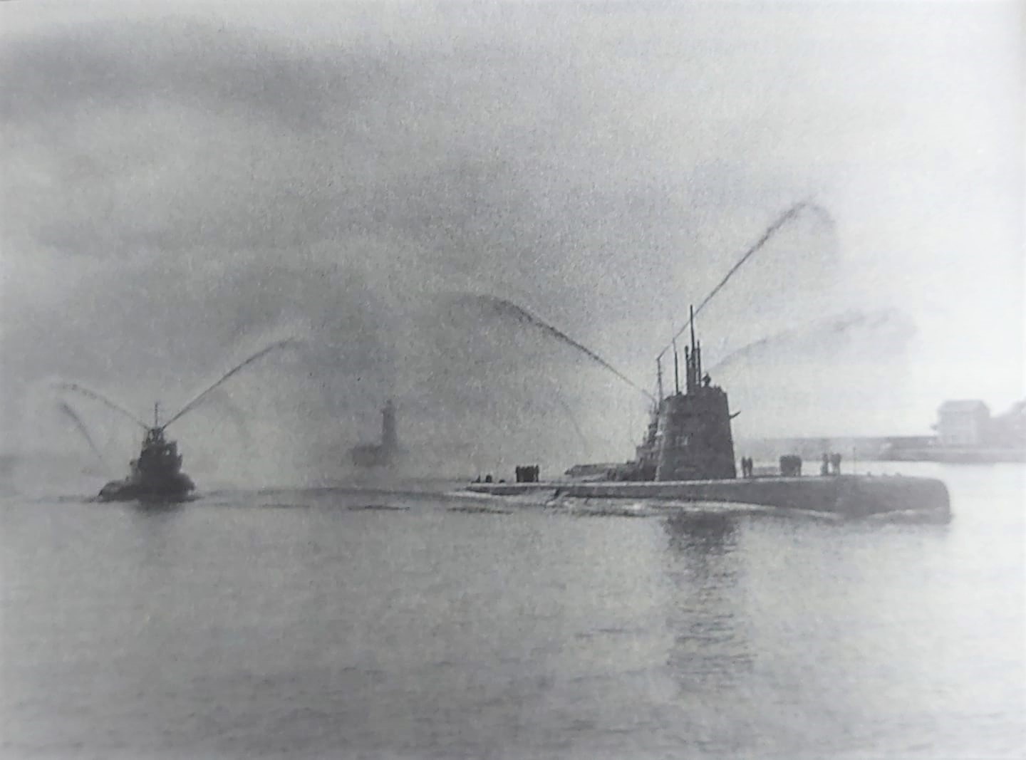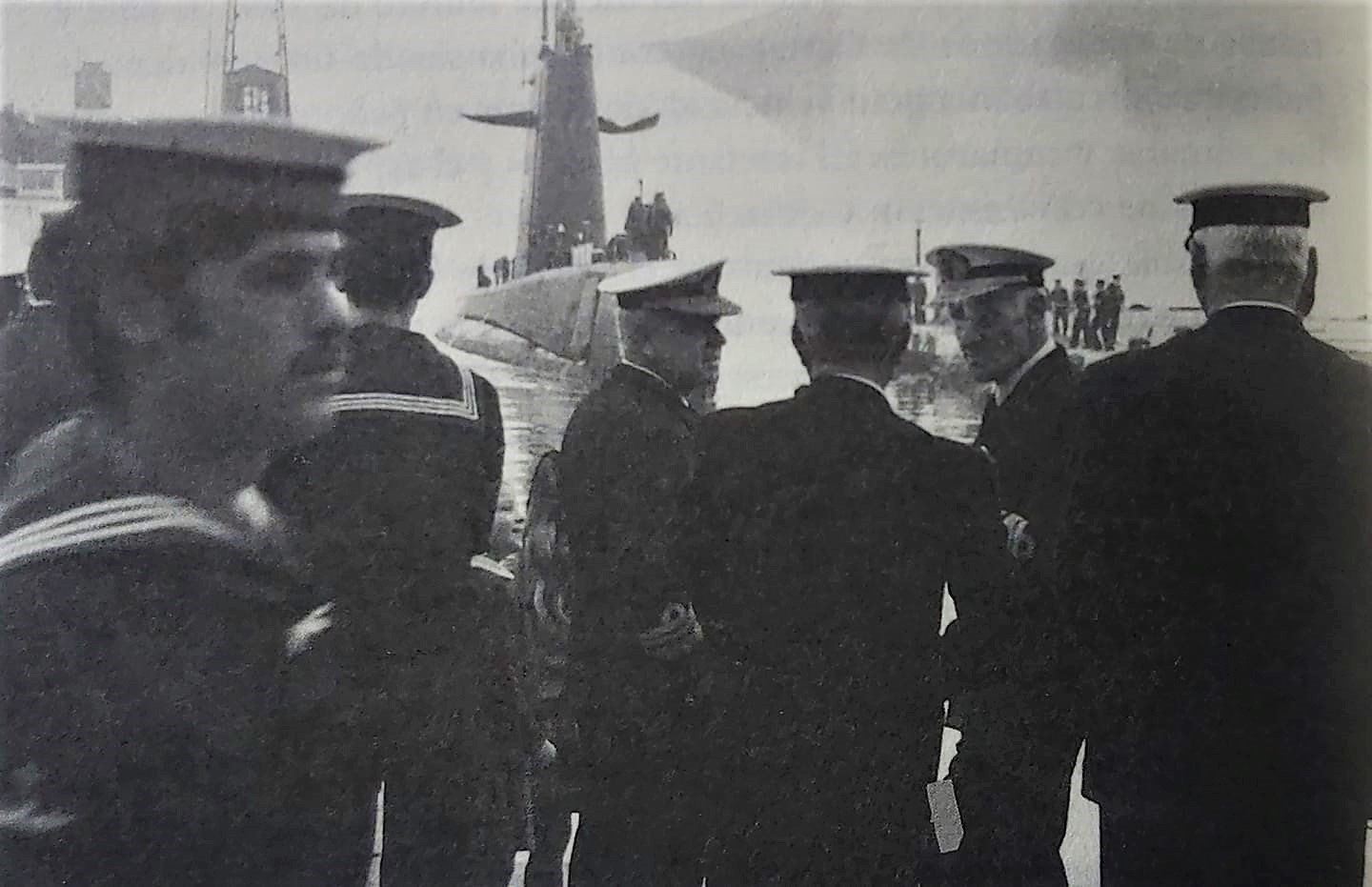 Pero por desgracia el comandante Chereguini no contó con un problema. Nos cuenta nuestro amigo Diego Quevedo que los remolcadores del Arsenal de Cartagena se acercaron al submarino y le lanzaron chorros de agua como señal de bienvenida, lo que hizo que la aleta de babor se estropeara y se doblara como si estuviera alabeando. El comandante Chereguini le hizo señales a los remolcadores para que desviaran los chorros de agua, pero ya era demasiado tarde, de forma que al atracar en el muelle la aleta izquierda presentaba un aspecto lamentable. Un marino del arsenal al ver así de doblada la aleta le preguntó a un suboficial submarinista por ese aspecto tan raro del timón de profundidad, a lo que el suboficial le respondió “eso será cosa de los americanos, mejor ni tocarlo” recordando la traducción libre del lema en latín del arma submarina española sobre “no tocar los aparatos” del Ad Utrumque Paratus (siempre preparados)