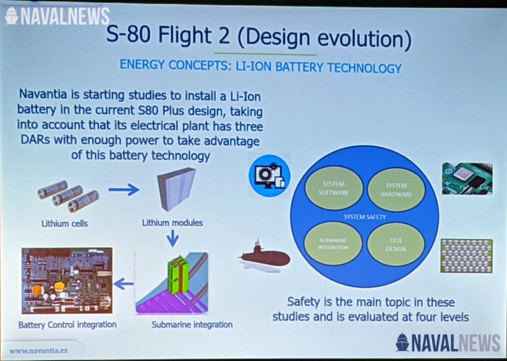 Hemos de destacar que los submarinos utilizan baterías convencionales de plomo ácido fabricadas por Exide (antigua Tudor). Desde que se inició el proyecto hace ya 20 años el desarrollo de baterías basadas en iones de Litio (Li-ion) ha dado pasos de gigante y ya Japón ha dotado a las últimas unidades de este tipo de baterías, tan capaces que ha decidido prescindir del sistema AIP Stirling usado en las primeras unidades de la serie. Tanto la francesa Saft como la alemana HDW han presentado sus propios modelos de baterías Li-ion para submarinos, que empezarán a difundirse en la próxima década. Sabemos que se ha iniciado un proyecto de I+D para el desarrollo nacional de esta tecnología, pero habría que ir planteándose la introducción de esta en los submarinos S-80, algo más complicado de lo que parece debido al peso de las baterías convencionales respecto a las Li-ion y que los centrajes de pesos y estabilidad se han calculado según el peso de los bancos de baterías convencionales