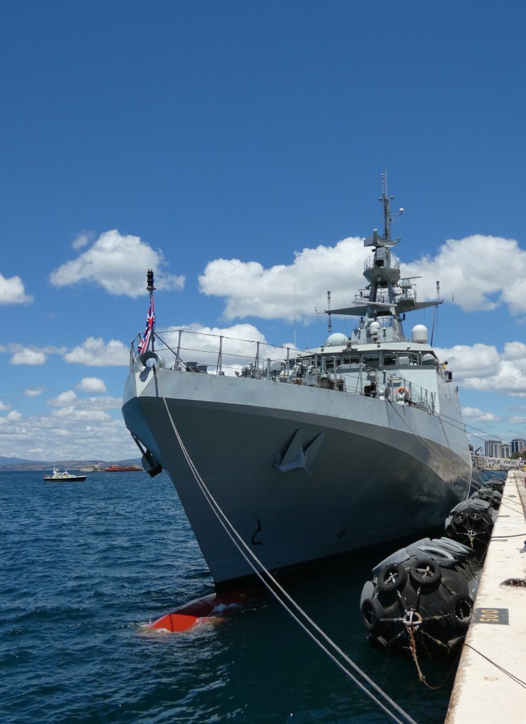 La HMS Dasher con una de las patrulleras de la policía de Gibraltar en segundo plano (Gorka L Martínez Mezo)