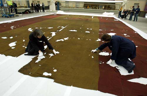 Técnicos conservadores del Museo Marítimo de Greenwich extendiendo la bandera española del navío San Ildefonso con sumo cuidado durante el bicentenario de la batalla naval de Trafalgar.