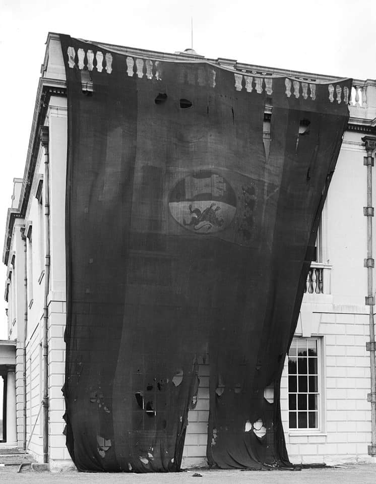 La bandera del navío San Ildefonso suspendida en el parapeto del Queen’s House, en el Museo Maritimo de Greenwich, para ser fotografiada en 1962.