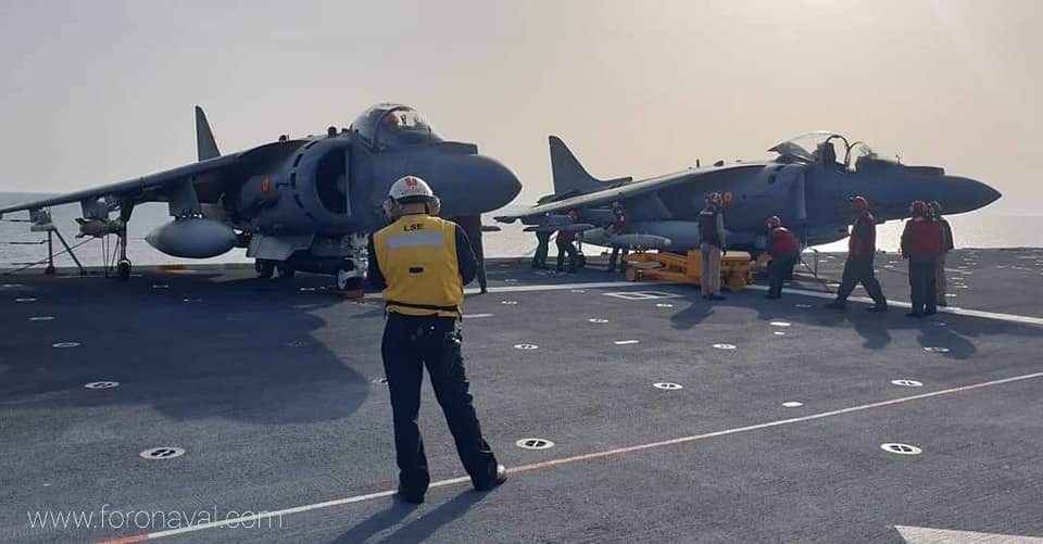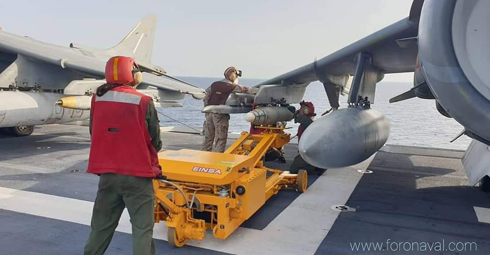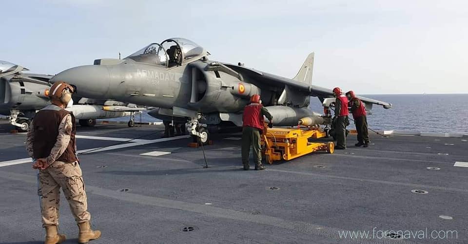 Los aviones embarcados han realizado un ejercicio de adiestramiento consistente en el planteamiento y ejecución de una operación de ataque con bombas sobre un objetivo situado tierra adentro partiendo y regresando al buque base, que se encontraría en aguas del Levante, usándose para la ejecución del mismo el Polígono de Tiro de Bardenas Reales, situado en Navarra.