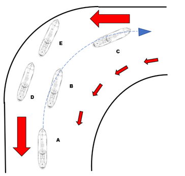 Es aconsejable tener una buena reserva de máquina para poder dar más potencia y, en consecuencia, más efecto de timón. Se debe encarar la curva navegando por el centro del canal, buscando que la proa quede un poco a estribor del eje de la curva recibiendo la corriente con el menor ángulo de incidencia posible hasta completar la curva (posiciones A, B y C de la figura ). Si el buque se encontrase en las posiciones D o E, al dar más máquina se tomaría mayor velocidad, pero no se evitaría la caída a babor. En caso de que el buque pierda el control, se podría usar el fondeo como sistema de emergencia, fondeando del lado de la corriente o bien dar máquina atrás para parar la arrancada, dejarlo llevar por la corriente e iniciar nuevamente la maniobra.