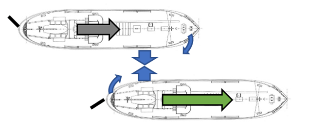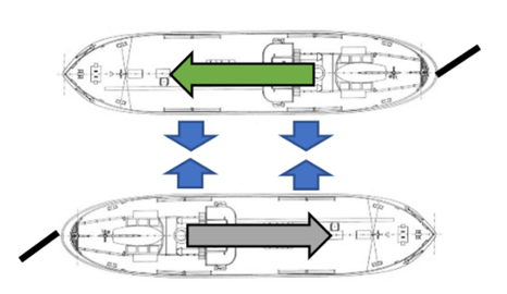 Posición 3, la popa de A es rechazada por la proa de B. De nuevo el momento de giro deberá ser compensado con la ayuda del timón que en este caso será metido a babor.
