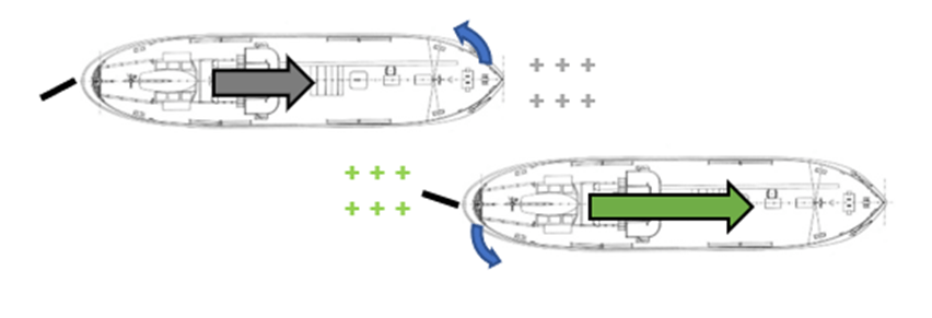 Por último, cuando el buque atracado entra dentro de la acción del tren de olas kelvin generadas por el buque A, sufre un empuje longitudinal en dirección del traslado de dichas olas (trazo de color verde).