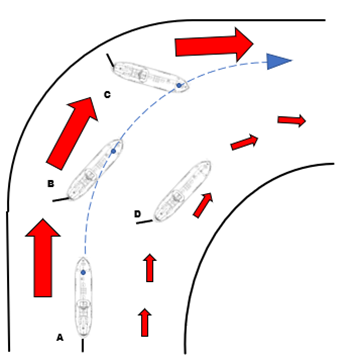 Si el buque entra con un determinado ángulo de incidencia (posición B), la corriente actuante en la aleta de estribor trata de llevar al buque a la posición C, lo que debe evitarse dando máquina y metiendo el timón a la banda contraria a la de la caída de la proa. Por otro lado, si se acerca demasiado al veril interno (posición D), la popa queda en aguas más rápidas y la corriente actuante sobre la aleta de estribor provoca un efecto similar al de las posiciones B y C. Poniendo el timón a babor se tratará de evitar esa guiñada.