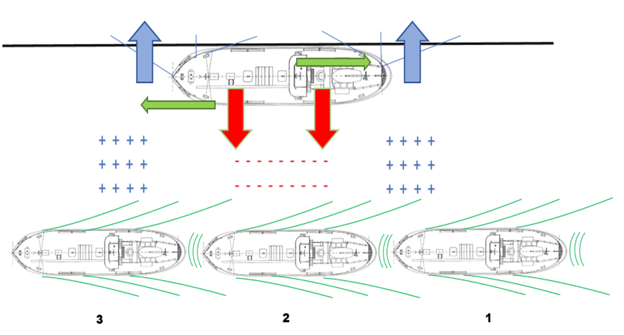 En la posición 1 la presión positiva de la proa del buque que navega empuja las aguas sobre el codaste del buque atracado, provocando un empuje de la popa hacia el muelle y en consecuencia de la proa hacia el centro del canal (trazo de color azul).