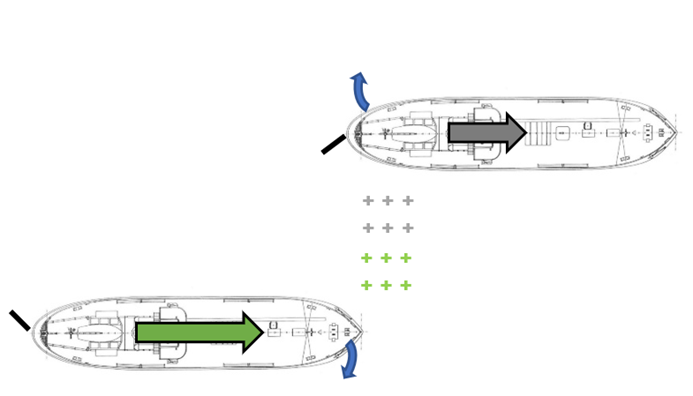 Por último, cuando el buque atracado entra dentro de la acción del tren de olas kelvin generadas por el buque A, sufre un empuje longitudinal en dirección del traslado de dichas olas (trazo de color verde).