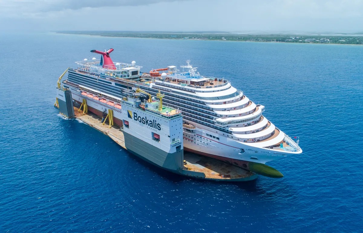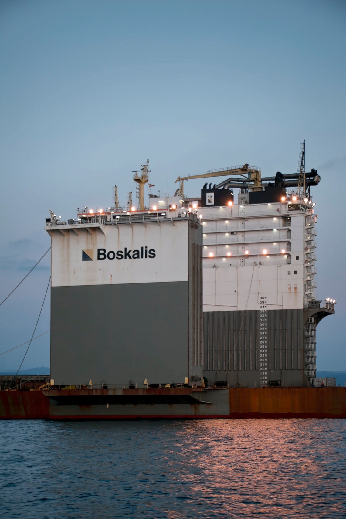 Fue construido en Corea del Sur para su propietaria, la holandesa Royal Boskalis Westminster N.V. Entró en servicio en 2012 y principalmente se dedica a la actividad petrolífera pero, como veis en una de las fotos, también transporta sobre «sus espaldas» otro tipo de embarcaciones.