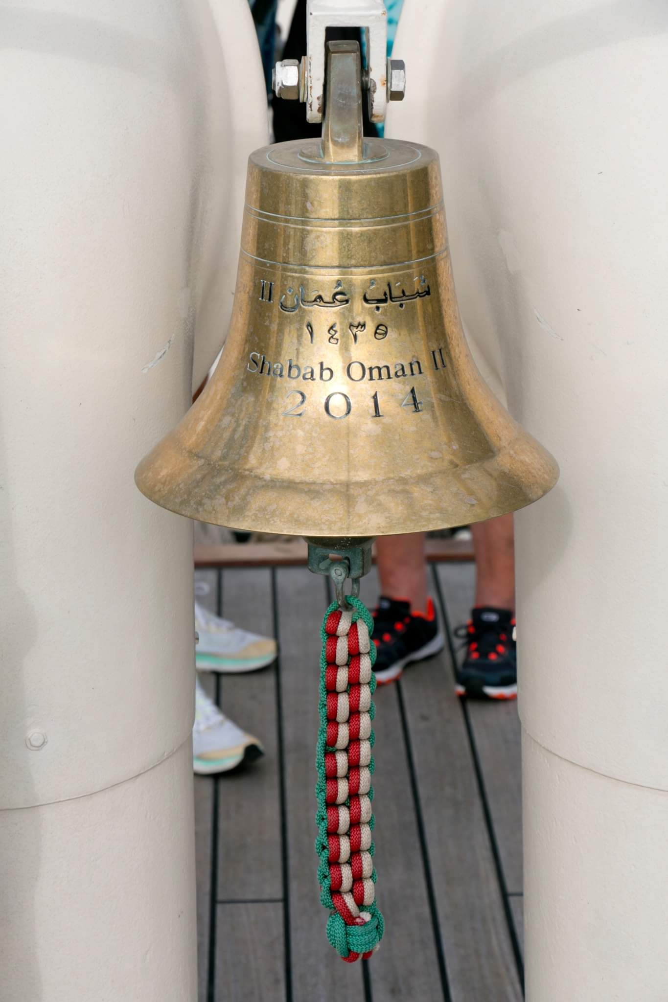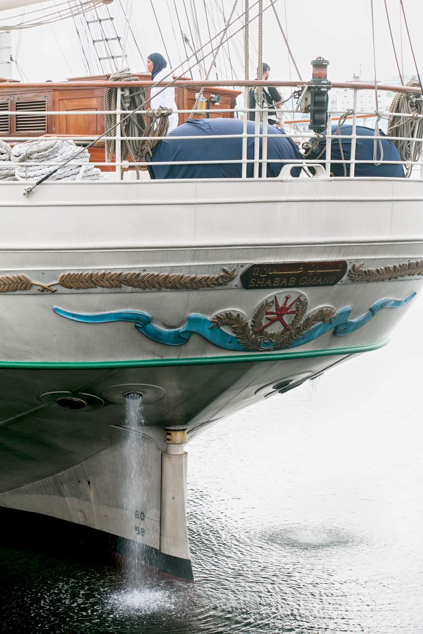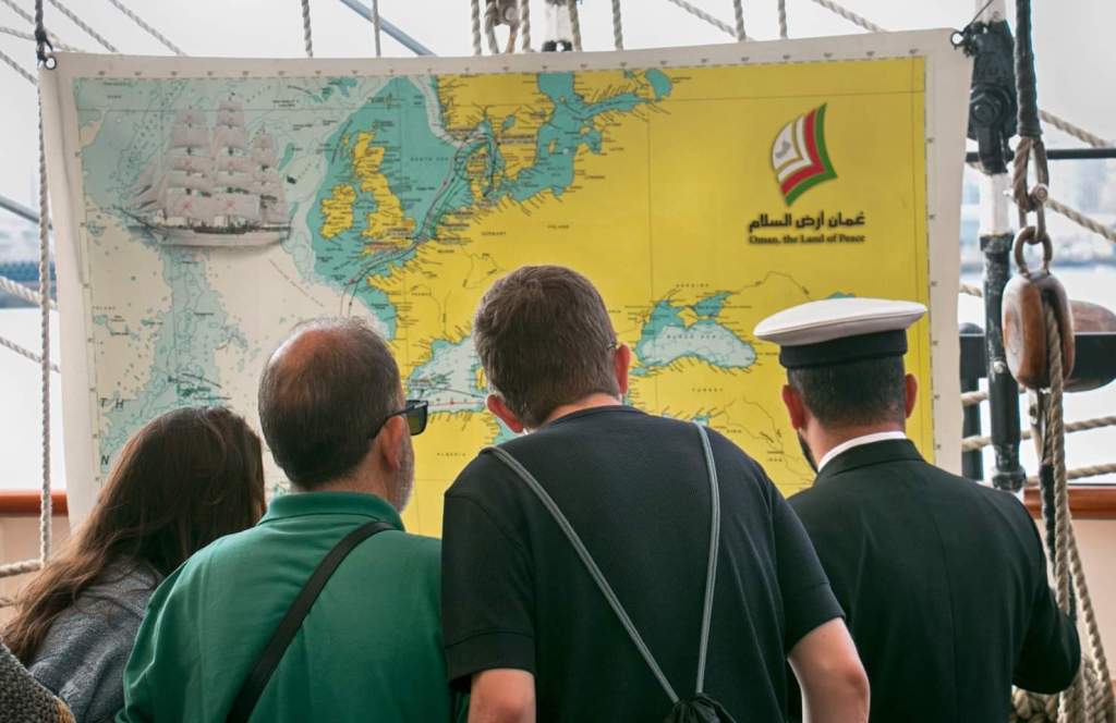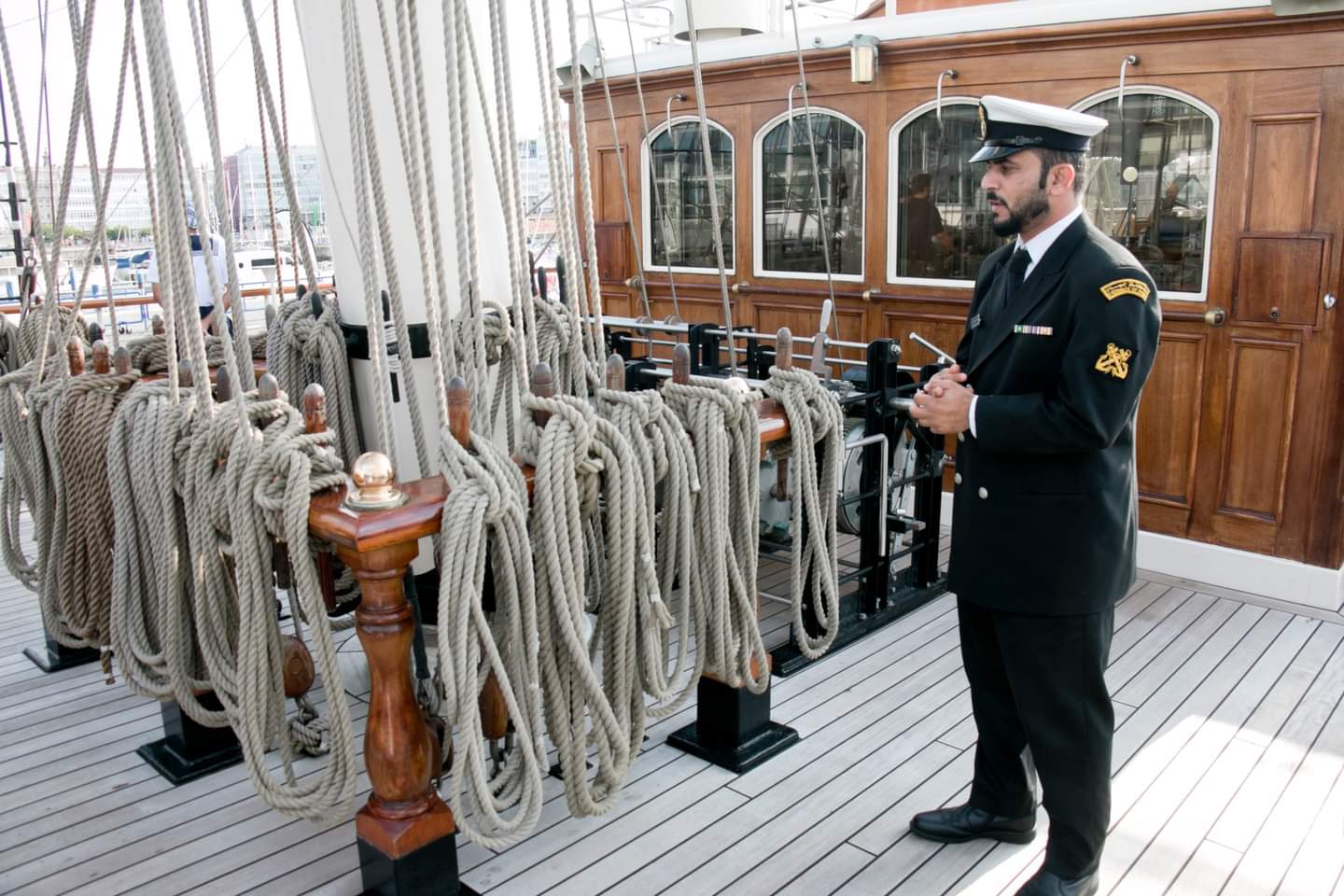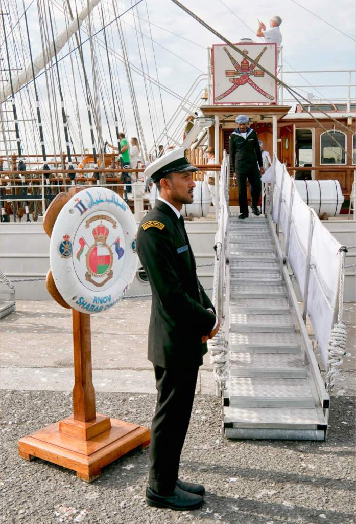 Nuestro guía a bordo. Sultán Mohammed Al-Salmi (FOTO: Manuel Candal)Maquinaria empleada en el manejo de los mástiles y las velas (FOTO: Manuel Candal)Bitácora y cofre, en cuyo interior se aloja un equipo de comunicaciones desde el que el comandante transmiten las órdenes de las maniobras (FOTO: Manuel Candal)En algunos detalles, como los salvapeldaños, se aprecia su país de origen (FOTO: Manuel Candal) ¡Selfie! El autor se autoretrata en el reflejo del cabrestante, perfectamente bruñido por la dotación (FOTO: Manuel Candal)Nuestro anfitrion mostrando el itinerario de este crucero de instrucción naval (FOTO: Manuel Candal)Los radares en los veleros deben ir protegidos para evitar que se enreden los cabos (FOTO: Manuel Candal)Los cabos están perfectamente adujados, tal y como se espera en un buque escuela militar (FOTO: Manuel Candal)Como todo buque que se precie, el Shabab Oman también tiene su campana, cuyo badajo tiene colgando una rabiza en forma filigrana náutica con los colores omaníes para tañirla (FOTO: Manuel Candal)Un marinero omaní consulta los mensajes que le llegan desde casa en el móvil (FOTO: Manuel Candal)En este crucero de instrucción, el buque escuela omaní lleva 10 mujeres a bordo como parte de la dotación (FOTO: Manuel Candal)Puente de gobierno. Se pueden aprediar los equipos de navegación y de comunicaciones (FOTO: Manuel Candal)La característica rueda de timón que llevan todos los grandes veleros (FOTO: Manuel Candal)Diferentes paneles y fotografías mostrando la bellezas del Sultanato de Omán (FOTO: Manuel Candal)Rocosqui colocado a pie de escala a modo de tropaion para dar la bienvenida a los visitantes del Shabab Oman II (FOTO: Manuel Candal)La adornada popa del Shabab Oman II (FOTO: Manuel Candal)La figura del mascarón de proa representa al marino y navegante árabe Ahmad bin Majid (FOTO: Manuel Candal)Regalos entregados a los visitantes. Todo un detalle no muy común de ver en otros buques (FOTO: Manuel Candal)El autor del artículo posa junto a un miembro de la dotación (FOTO: Manuel Candal)El Shabab Oman tracado en el Muelle de trasatlánticos del puerto de A Coruña (FOTO: Manuel Candal)La lancha de prácticos cruza por delante de la proa del velero para retornar al puerto. Se puede apreciar el escudo heráldico de Oman dibujado en las velas, consistente en dos cimitarras y dos dagas khunjar cruzados en panoplia (FOTO: Manuel Candal) Finalmente el Shabab Oman desplegó algunas velas, las del palo trinquete, mientras se alejaba de A Coruña. Aquí lo podemos ver desde la icónica La Caracola (FOTO: Manuel Candal)