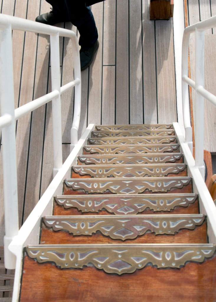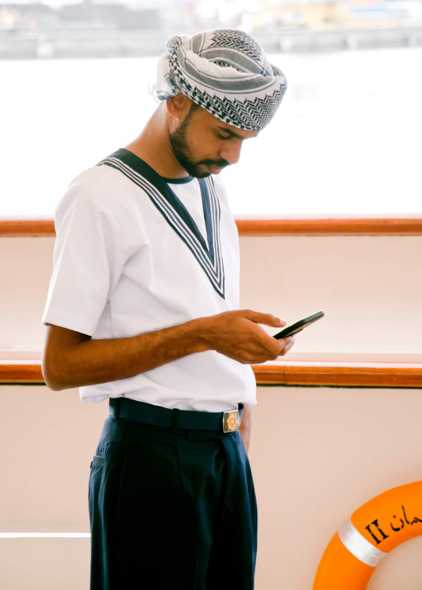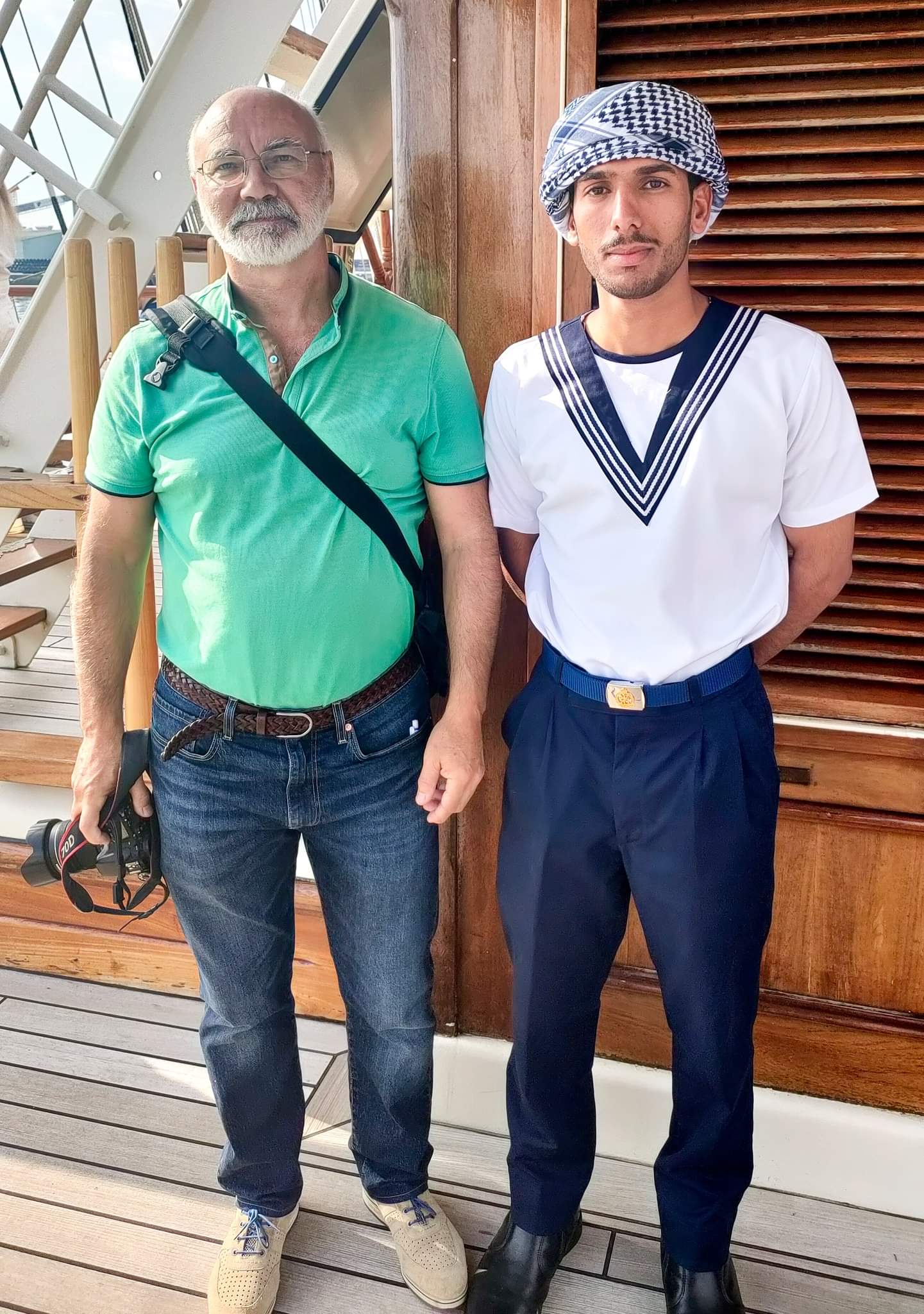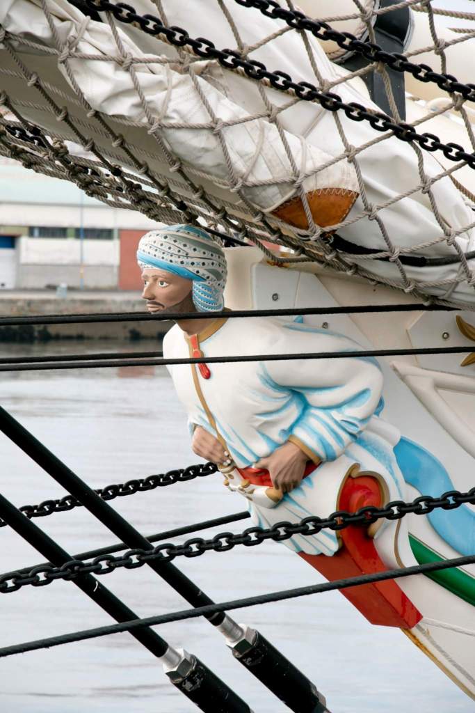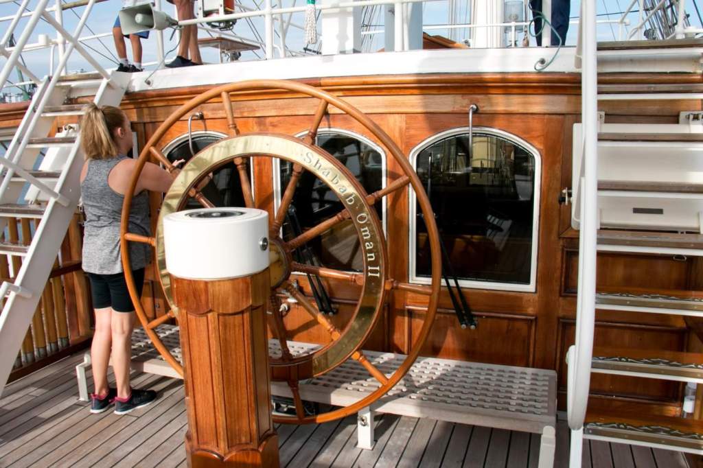 Nuestro guía a bordo. Sultán Mohammed Al-Salmi (FOTO: Manuel Candal)Maquinaria empleada en el manejo de los mástiles y las velas (FOTO: Manuel Candal)Bitácora y cofre, en cuyo interior se aloja un equipo de comunicaciones desde el que el comandante transmiten las órdenes de las maniobras (FOTO: Manuel Candal)En algunos detalles, como los salvapeldaños, se aprecia su país de origen (FOTO: Manuel Candal) ¡Selfie! El autor se autoretrata en el reflejo del cabrestante, perfectamente bruñido por la dotación (FOTO: Manuel Candal)Nuestro anfitrion mostrando el itinerario de este crucero de instrucción naval (FOTO: Manuel Candal)Los radares en los veleros deben ir protegidos para evitar que se enreden los cabos (FOTO: Manuel Candal)Los cabos están perfectamente adujados, tal y como se espera en un buque escuela militar (FOTO: Manuel Candal)Como todo buque que se precie, el Shabab Oman también tiene su campana, cuyo badajo tiene colgando una rabiza en forma filigrana náutica con los colores omaníes para tañirla (FOTO: Manuel Candal)Un marinero omaní consulta los mensajes que le llegan desde casa en el móvil (FOTO: Manuel Candal)En este crucero de instrucción, el buque escuela omaní lleva 10 mujeres a bordo como parte de la dotación (FOTO: Manuel Candal)Puente de gobierno. Se pueden aprediar los equipos de navegación y de comunicaciones (FOTO: Manuel Candal)La característica rueda de timón que llevan todos los grandes veleros (FOTO: Manuel Candal)Diferentes paneles y fotografías mostrando la bellezas del Sultanato de Omán (FOTO: Manuel Candal)Rocosqui colocado a pie de escala a modo de tropaion para dar la bienvenida a los visitantes del Shabab Oman II (FOTO: Manuel Candal)La adornada popa del Shabab Oman II (FOTO: Manuel Candal)La figura del mascarón de proa representa al marino y navegante árabe Ahmad bin Majid (FOTO: Manuel Candal)Regalos entregados a los visitantes. Todo un detalle no muy común de ver en otros buques (FOTO: Manuel Candal)El autor del artículo posa junto a un miembro de la dotación (FOTO: Manuel Candal)El Shabab Oman tracado en el Muelle de trasatlánticos del puerto de A Coruña (FOTO: Manuel Candal)La lancha de prácticos cruza por delante de la proa del velero para retornar al puerto. Se puede apreciar el escudo heráldico de Oman dibujado en las velas, consistente en dos cimitarras y dos dagas khunjar cruzados en panoplia (FOTO: Manuel Candal) Finalmente el Shabab Oman desplegó algunas velas, las del palo trinquete, mientras se alejaba de A Coruña. Aquí lo podemos ver desde la icónica La Caracola (FOTO: Manuel Candal)
