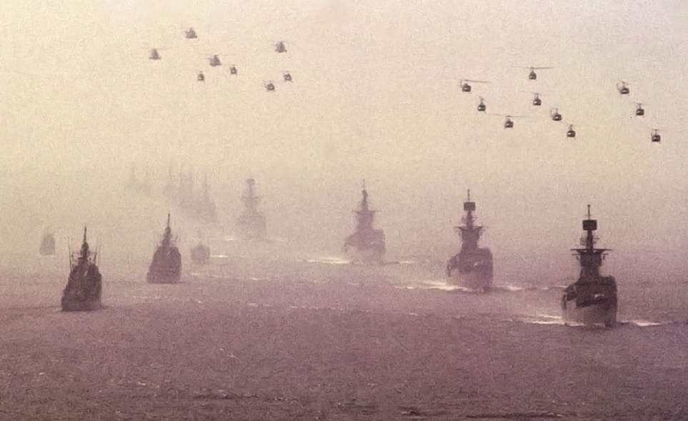 Abría el desfile el portaaeronaves Dédalo (R-O1) y, siguiendo su estela, el resto de las unidades: fragatas de la 31ª Escuadrilla de Escoltas Extremadura (F-75), Cataluña (F-73), Asturias (F-74) y Andalucía (F-72), los destructores pertenecientes a la 11ª Escuadrilla de Escoltas Lángara (D-64), Blas de Lezo (D-65) y Méndez Núñez (D-63) y, finalmente, el submarino Delfín (S-61).