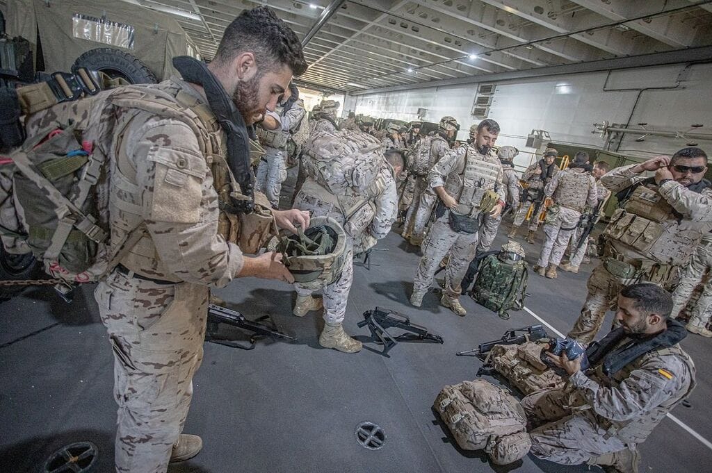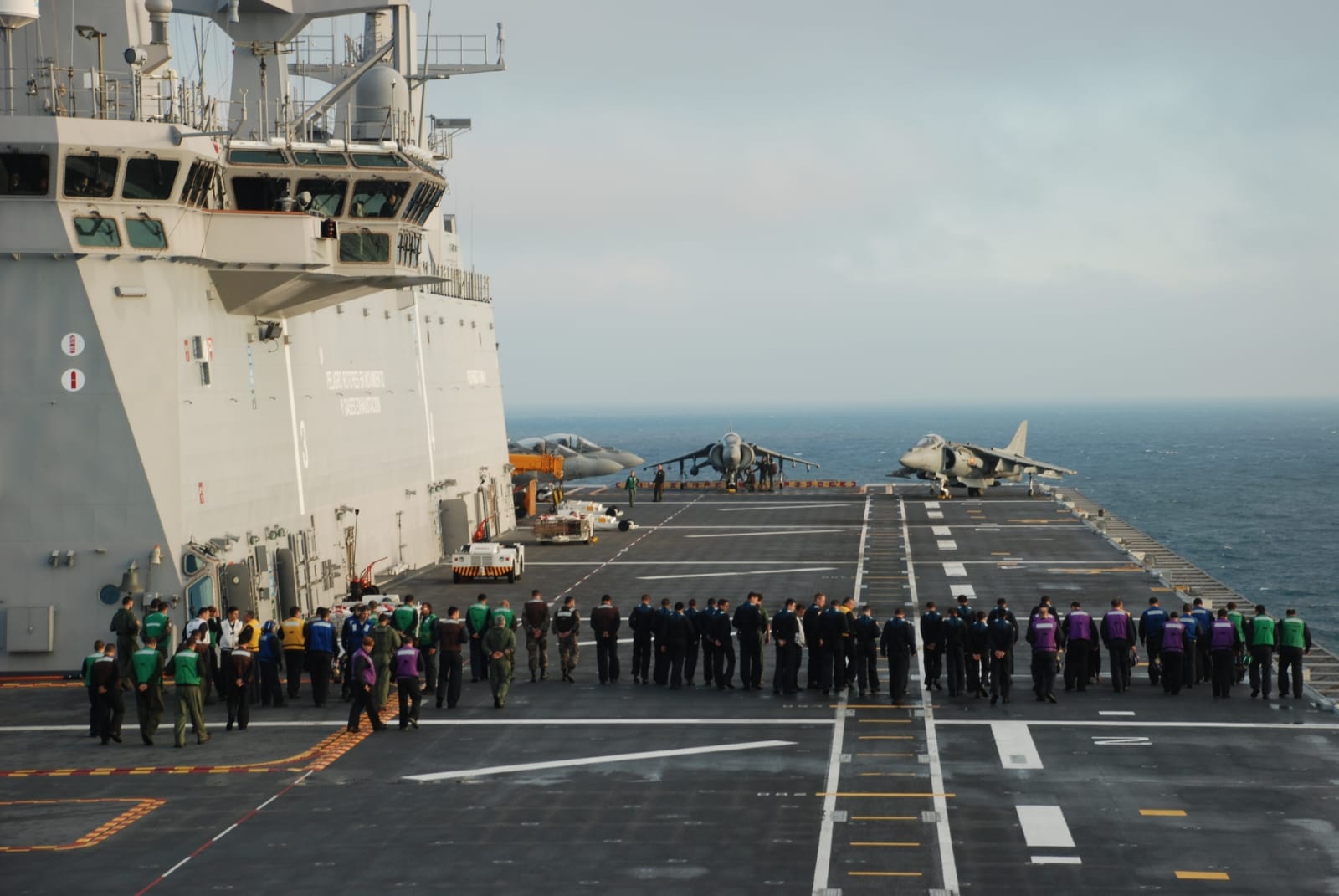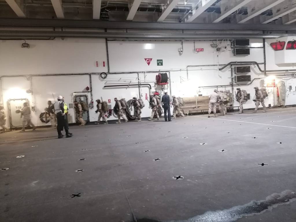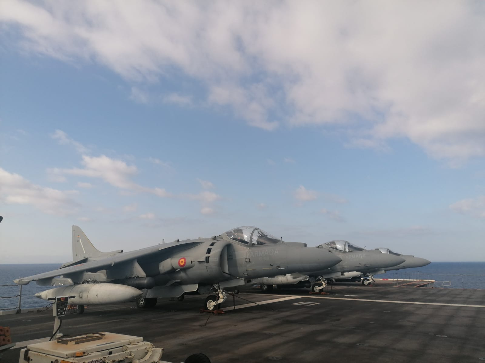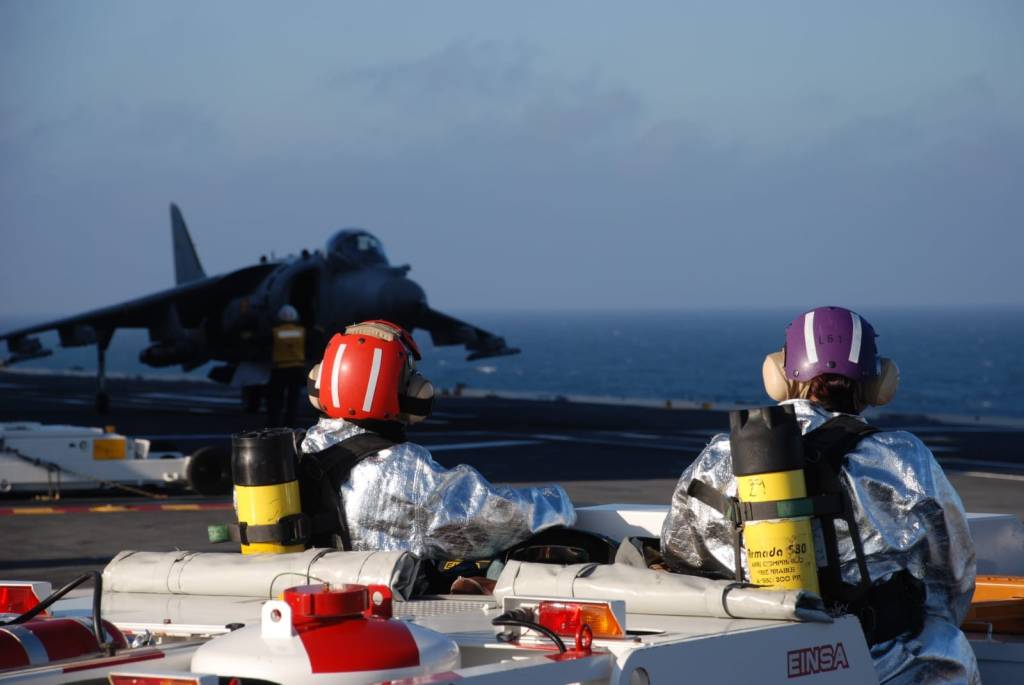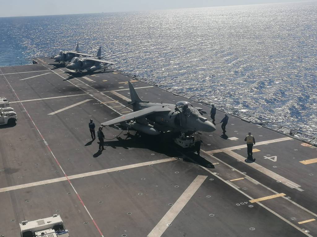 La dotación del LHD Juan Carlos I posa junto a los infantes de Marina del TEAR y mandos de la OTAN ocupando casi toda la cubierta de vuelo (FOTO: Armada)Cuando no se desarrollan operaciones aéreas, la cubierta de vuelo es aprovechada por los infantes de Marina para practicar sus ejercicios cotidianos (FOTO: Armada)Los infantes de Marina nunca descuidan su forma física (FOTO: Armada)Algunos pilotos de la FLOAN y dotación del Juan Carlos I se sumaron al entrenamiento del TEAR (FOTO: Armada)El boxeo sigue siendo una tradición deportiva en la Infantería de Marina (FOTO: Armada)El boxeo ayuda a mejorar los reflejos en el entrenamiento (FOTO: Armada)Personal de la FLOAN antiende a un Harrier. Echar agua a la turbina sirve para aumentar la potencia del motor Roll Royce Pegasus (FOTO: Armada)Los armeros se disponen a municionar un Harrier para una mision CAS (FOTO: Armada)La munición es transportada con seguridad por los armeros hasta los Harrier (FOTO: Armada)Tres Harrier se situan sobre el «Train-Line» de la cubierta de vuelo (FOTO: Armada)Harrier trincado en la cubierta de vuelo del Juan Carlos I. Por detras la fragata Navarra actuando de escolta (FOTO: Armada)Las RHIB Duarry Supercat esperan junto al Juan Carlos I (FOTO: Armada)Personal del Servicio de Vuelo y de la FLOAN se disponen a desplegar el rotor de un SH60F Oceanhawk (FOTO: Armada)El plegado del rotor principal permite que el helicóptero ocupe menos espacio en el hangar (FOTO: Armada)De ser necesario, la cola del helicoptero también se puede llegar a plegar, reduciendo así su volumén (FOTO: Armada)Pilotos de la FLOAN realizan la inspección de prevuelo de su helicoptero SH-60F Oceanhawk (FOTO: Armada)La puesta del sol no interrumpió las operaciones de vuelo (FOTO: Armada)Personal del Servicio de vuelo se dispone a colocar los calzos y las trincas en un helicóptero tras tomar en la cubierta de vuelo (FOTO: Armada)Los bomberos observan… siempre atentos (FOTO: Armada)En el «Tren Amarillo» hay toda clase de vehículos específicos para el sostenimiento de las operaciones aéreas a bordo del LHD Juan Carlos I, como este EINSA de contención anti-incendios (FOTO: Armada)Los bomberos ocupan su puesto es espera por si fuera necesaeia su intervención (FOTO: Armada)La seguridad en las operaciones en la cubierta de vuelo resulta vital. Vehículo del «Tren Amarillo» de lucha anti-incendios (FOTO: Armada)Un Harrier se dispone a tomar verticalmente sobre la cubierta de vuelo bajo la atenta mirada del personal del Servicio de Vuelo (FOTO: Armada)Simulacro de incendio en la cubierta de vuelo (FOTO: Armada)Personal del Servicio de Vuelo organizando la faena (FOTO: Armada)Tras el simulacro de incendio se retira todo el material de la cubierta de vuelo (FOTO: Armada)Personal del Servicio de Vuelo se mueven sobre la cubierta con los llamativos trajes anti-exposición de alta visibilidad (FOTO: Armada)Un Harrier se prepara para despegar desde el LHD Juan Carlos I(FOTO: Armada)Aviones Harrier trincados en la cubierta de vuelo (FOTO: Armada)Un Harrier se dispone a tomar verticálmente sobre la cubierta de vuelo del buque Juan Carlos I (FOTO: Armada)Vista desde el LHD Juan Carlos I de las lanchas LCM-1E partiendo hacia la costa turca (FOTO: Armada)Tres aviones Harrier trincados por detrás de la isla del LHD Juan Carlos I (FOTO: Armada)La dotación del LHD Juan Carlos I realiza un paseo FOD sobre la cubierta de vuelo para repasar que no haya ningún objeto que pueda suponer un peligro para las operaciones aéreas (FOTO: Armada)Paseo FOD (siglas de Foregn Object Damage) sobre la cubierta de vuelo. La seguridad se toma muy en serio (FOTO: Armada)La costa turca vista desde el Juan Carlos I (FOTO: Armada)La cubierta de vuelo del LHD Juan Carlos I dispone de balizamiento lumínico para ayudar a las operaciones de vuelo nocturnas (FOTO: Armada)Los infantes de Marina realizan un «Fast Roap» desde un SH-60F Oceanhawk (FOTO: Armada)Los helicópteros son una gran herramienta táctica para los infantes de Marina, al permitirles un despliegue rápido en sus asaltos anfibios verticales (FOTO: Armada)Unos armeros del LHD Juan Carlos I realizan el mantenimiento de una estación RWS Sentinel 2.0 de Escribano tras un ejercicio de tiro. Observar los casquillos sobre la cubierta (FOTO: Armada)Una señalero indica una posición durante un ejercicio (FOTO: Armada)Un infante de Marina practica un rápel por el hueco de un elevador del LHD Juan Carlos I durante el entrenamiento (FOTO: Armada)Los infantes de Marina se preparan antes de embarcar en las lanchas de desembarco LCM-1E (FOTO: Armada)Los infantes de Marina reembarcando de nuevo en el LHD Juan Carlos I (FOTO: Armada)Una lancha LCM-1E maniobra dentro del dique inundable del LPD Castilla (FOTO: Armada)Una lancha LCM-1E parte desde el dique inundable del LPD Juan Carlos I con dos camiones de 6 tn del TEAR (FOTO: Armada)La pluma de babor del LPD Castilla se dispone a botar una RHIB Duarry Supercar de asalto anfibio (FOTO: Armada)Los «Dragones del Viento» cabalgando sobre las olas a bordo de sus monturas Duarry Supercat (FOTO: Armada)Infantes de Marina abordando una RHIB Duarry Supercat de asalto anfibio (FOTO: Armada)Una lancha de desembarco LCM-1E se dispone a arribar al rebalaje de una playa turca portando dos VCI Piraña IIIC (FOTO: Armada)Las siempre eficaces LCM-1E del Grupo Naval de Playa volvieron a demostrar una vez más su alta capacidad de trabajo en operaciones anfibias (FOTO: Armada)Una lancha LCM-1E se aproxima a la playa con un vehiculo de combate de infantería Piraña IIIC (FOTO: Armada)Una lancha LCM-1E deposita sobre la playa de Doganbey un camión Iveco-Pegaso 6×6 del Tercio de Armada (FOTO: Armada)Vehículos Iveco-Pegaso y Uro VAMTAC de la Infantería de Marina en la playa turca de Doganbey (FOTO: Armada)Dos lanchas LCM-1E transportan de vuelta varios vehículos del TEAR a su buque nodriza (FOTO: Armada)Los LPD Castilla y FFG Navarra vistos desde el LHD Juan Carlos I (FOTO: Arma