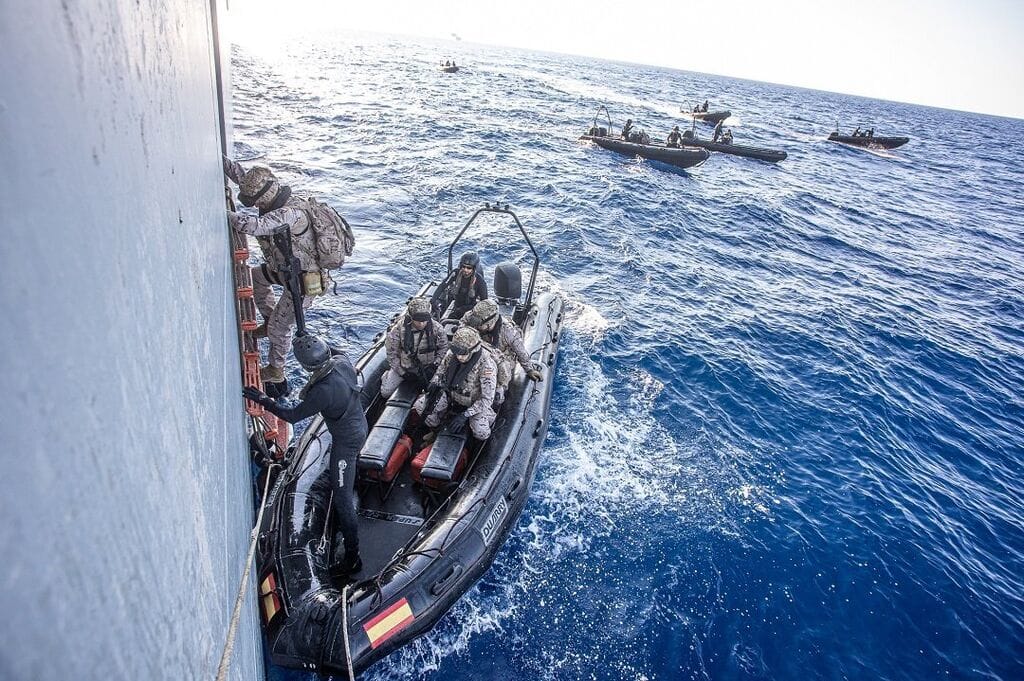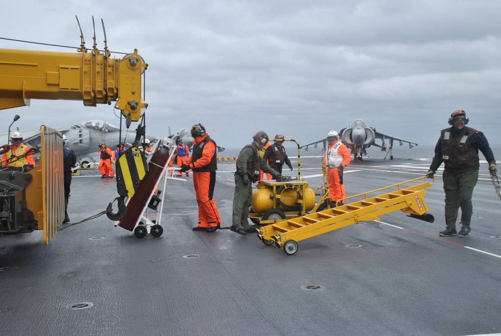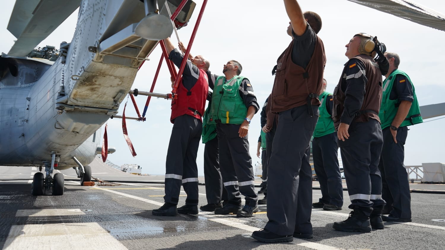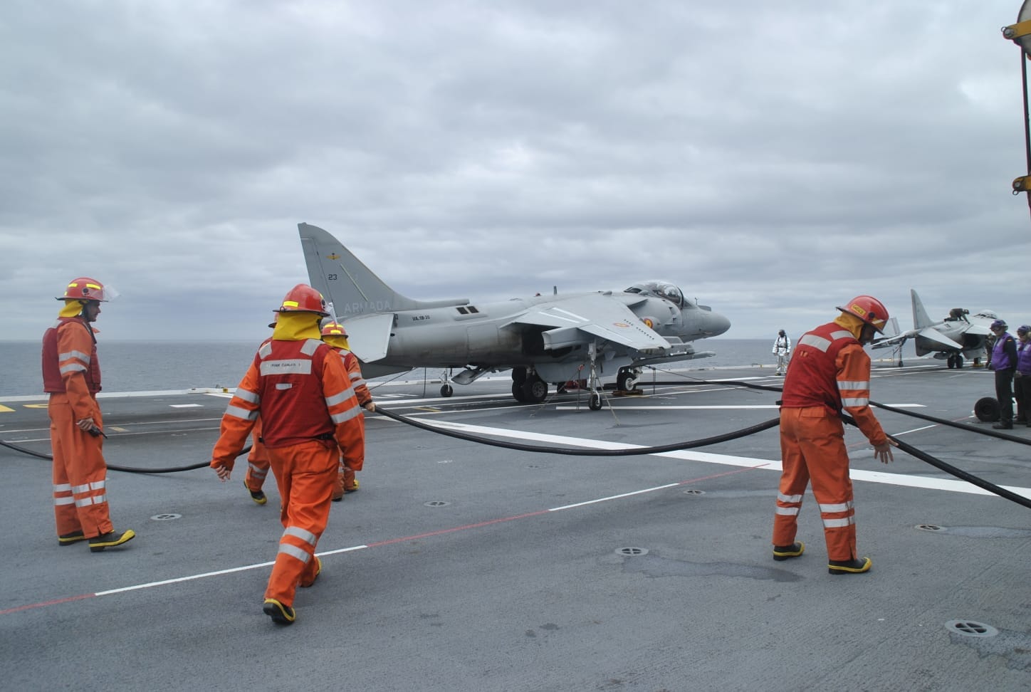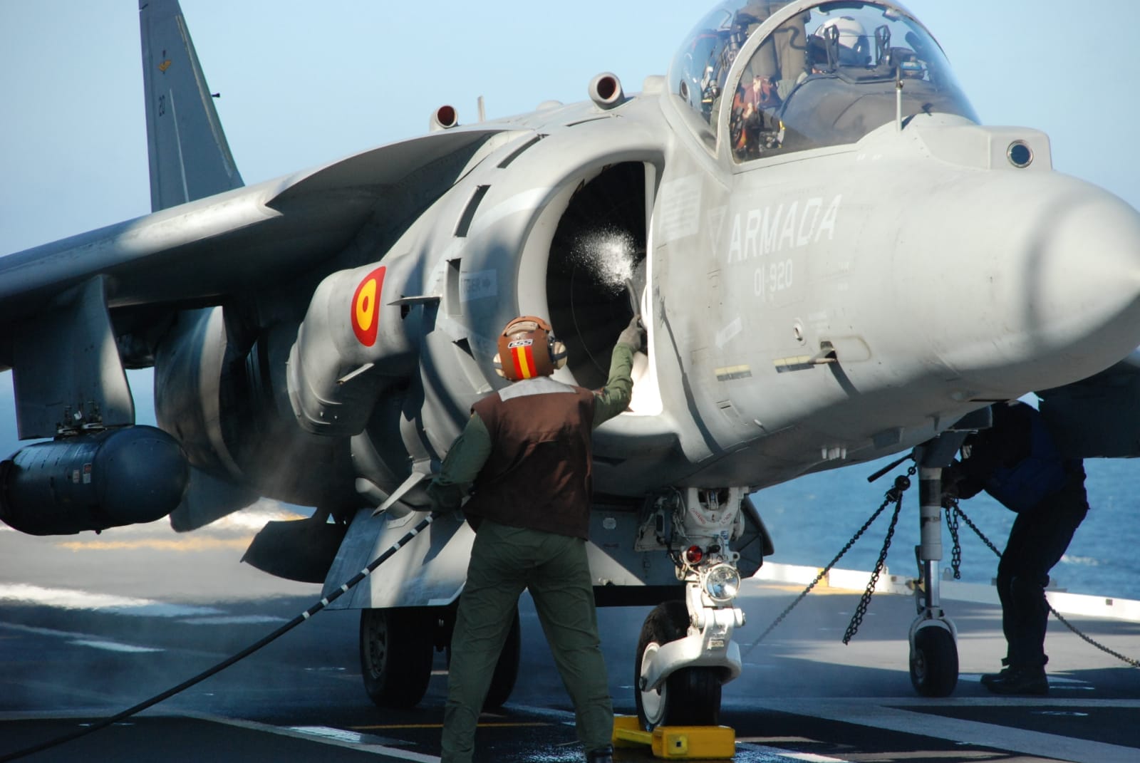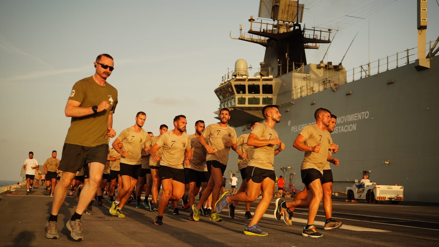 La dotación del LHD Juan Carlos I posa junto a los infantes de Marina del TEAR y mandos de la OTAN ocupando casi toda la cubierta de vuelo (FOTO: Armada)Cuando no se desarrollan operaciones aéreas, la cubierta de vuelo es aprovechada por los infantes de Marina para practicar sus ejercicios cotidianos (FOTO: Armada)Los infantes de Marina nunca descuidan su forma física (FOTO: Armada)Algunos pilotos de la FLOAN y dotación del Juan Carlos I se sumaron al entrenamiento del TEAR (FOTO: Armada)El boxeo sigue siendo una tradición deportiva en la Infantería de Marina (FOTO: Armada)El boxeo ayuda a mejorar los reflejos en el entrenamiento (FOTO: Armada)Personal de la FLOAN antiende a un Harrier. Echar agua a la turbina sirve para aumentar la potencia del motor Roll Royce Pegasus (FOTO: Armada)Los armeros se disponen a municionar un Harrier para una mision CAS (FOTO: Armada)La munición es transportada con seguridad por los armeros hasta los Harrier (FOTO: Armada)Tres Harrier se situan sobre el «Train-Line» de la cubierta de vuelo (FOTO: Armada)Harrier trincado en la cubierta de vuelo del Juan Carlos I. Por detras la fragata Navarra actuando de escolta (FOTO: Armada)Las RHIB Duarry Supercat esperan junto al Juan Carlos I (FOTO: Armada)Personal del Servicio de Vuelo y de la FLOAN se disponen a desplegar el rotor de un SH60F Oceanhawk (FOTO: Armada)El plegado del rotor principal permite que el helicóptero ocupe menos espacio en el hangar (FOTO: Armada)De ser necesario, la cola del helicoptero también se puede llegar a plegar, reduciendo así su volumén (FOTO: Armada)Pilotos de la FLOAN realizan la inspección de prevuelo de su helicoptero SH-60F Oceanhawk (FOTO: Armada)La puesta del sol no interrumpió las operaciones de vuelo (FOTO: Armada)Personal del Servicio de vuelo se dispone a colocar los calzos y las trincas en un helicóptero tras tomar en la cubierta de vuelo (FOTO: Armada)Los bomberos observan… siempre atentos (FOTO: Armada)En el «Tren Amarillo» hay toda clase de vehículos específicos para el sostenimiento de las operaciones aéreas a bordo del LHD Juan Carlos I, como este EINSA de contención anti-incendios (FOTO: Armada)Los bomberos ocupan su puesto es espera por si fuera necesaeia su intervención (FOTO: Armada)La seguridad en las operaciones en la cubierta de vuelo resulta vital. Vehículo del «Tren Amarillo» de lucha anti-incendios (FOTO: Armada)Un Harrier se dispone a tomar verticalmente sobre la cubierta de vuelo bajo la atenta mirada del personal del Servicio de Vuelo (FOTO: Armada)Simulacro de incendio en la cubierta de vuelo (FOTO: Armada)Personal del Servicio de Vuelo organizando la faena (FOTO: Armada)Tras el simulacro de incendio se retira todo el material de la cubierta de vuelo (FOTO: Armada)Personal del Servicio de Vuelo se mueven sobre la cubierta con los llamativos trajes anti-exposición de alta visibilidad (FOTO: Armada)Un Harrier se prepara para despegar desde el LHD Juan Carlos I(FOTO: Armada)Aviones Harrier trincados en la cubierta de vuelo (FOTO: Armada)Un Harrier se dispone a tomar verticálmente sobre la cubierta de vuelo del buque Juan Carlos I (FOTO: Armada)Vista desde el LHD Juan Carlos I de las lanchas LCM-1E partiendo hacia la costa turca (FOTO: Armada)Tres aviones Harrier trincados por detrás de la isla del LHD Juan Carlos I (FOTO: Armada)La dotación del LHD Juan Carlos I realiza un paseo FOD sobre la cubierta de vuelo para repasar que no haya ningún objeto que pueda suponer un peligro para las operaciones aéreas (FOTO: Armada)Paseo FOD (siglas de Foregn Object Damage) sobre la cubierta de vuelo. La seguridad se toma muy en serio (FOTO: Armada)La costa turca vista desde el Juan Carlos I (FOTO: Armada)La cubierta de vuelo del LHD Juan Carlos I dispone de balizamiento lumínico para ayudar a las operaciones de vuelo nocturnas (FOTO: Armada)Los infantes de Marina realizan un «Fast Roap» desde un SH-60F Oceanhawk (FOTO: Armada)Los helicópteros son una gran herramienta táctica para los infantes de Marina, al permitirles un despliegue rápido en sus asaltos anfibios verticales (FOTO: Armada)Unos armeros del LHD Juan Carlos I realizan el mantenimiento de una estación RWS Sentinel 2.0 de Escribano tras un ejercicio de tiro. Observar los casquillos sobre la cubierta (FOTO: Armada)Una señalero indica una posición durante un ejercicio (FOTO: Armada)Un infante de Marina practica un rápel por el hueco de un elevador del LHD Juan Carlos I durante el entrenamiento (FOTO: Armada)Los infantes de Marina se preparan antes de embarcar en las lanchas de desembarco LCM-1E (FOTO: Armada)Los infantes de Marina reembarcando de nuevo en el LHD Juan Carlos I (FOTO: Armada)Una lancha LCM-1E maniobra dentro del dique inundable del LPD Castilla (FOTO: Armada)Una lancha LCM-1E parte desde el dique inundable del LPD Juan Carlos I con dos camiones de 6 tn del TEAR (FOTO: Armada)La pluma de babor del LPD Castilla se dispone a botar una RHIB Duarry Supercar de asalto anfibio (FOTO: Armada)Los «Dragones del Viento» cabalgando sobre las olas a bordo de sus monturas Duarry Supercat (FOTO: Armada)Infantes de Marina abordando una RHIB Duarry Supercat de asalto anfibio (FOTO: Armada)Una lancha de desembarco LCM-1E se dispone a arribar al rebalaje de una playa turca portando dos VCI Piraña IIIC (FOTO: Armada)Las siempre eficaces LCM-1E del Grupo Naval de Playa volvieron a demostrar una vez más su alta capacidad de trabajo en operaciones anfibias (FOTO: Armada)Una lancha LCM-1E se aproxima a la playa con un vehiculo de combate de infantería Piraña IIIC (FOTO: Armada)Una lancha LCM-1E deposita sobre la playa de Doganbey un camión Iveco-Pegaso 6×6 del Tercio de Armada (FOTO: Armada)Vehículos Iveco-Pegaso y Uro VAMTAC de la Infantería de Marina en la playa turca de Doganbey (FOTO: Armada)Dos lanchas LCM-1E transportan de vuelta varios vehículos del TEAR a su buque nodriza (FOTO: Armada)Los LPD Castilla y FFG Navarra vistos desde el LHD Juan Carlos I (FOTO: Arma