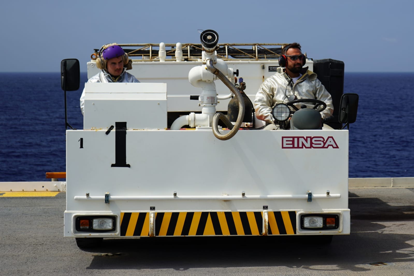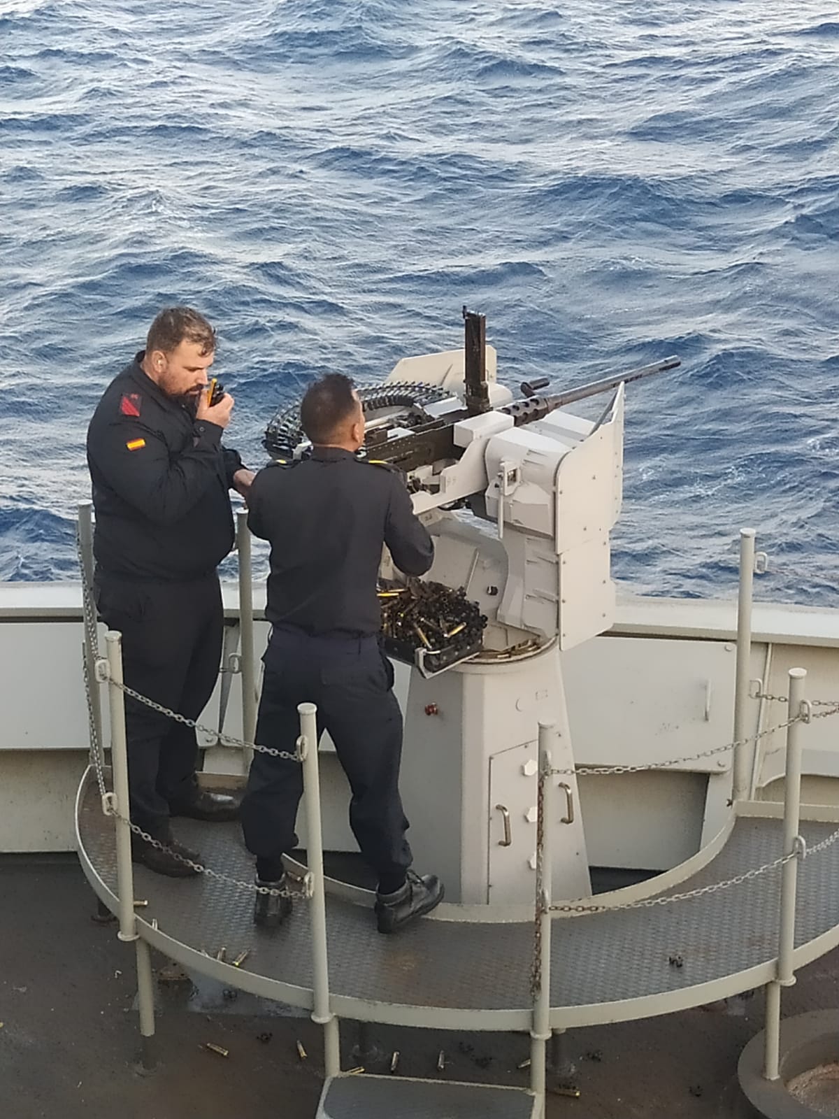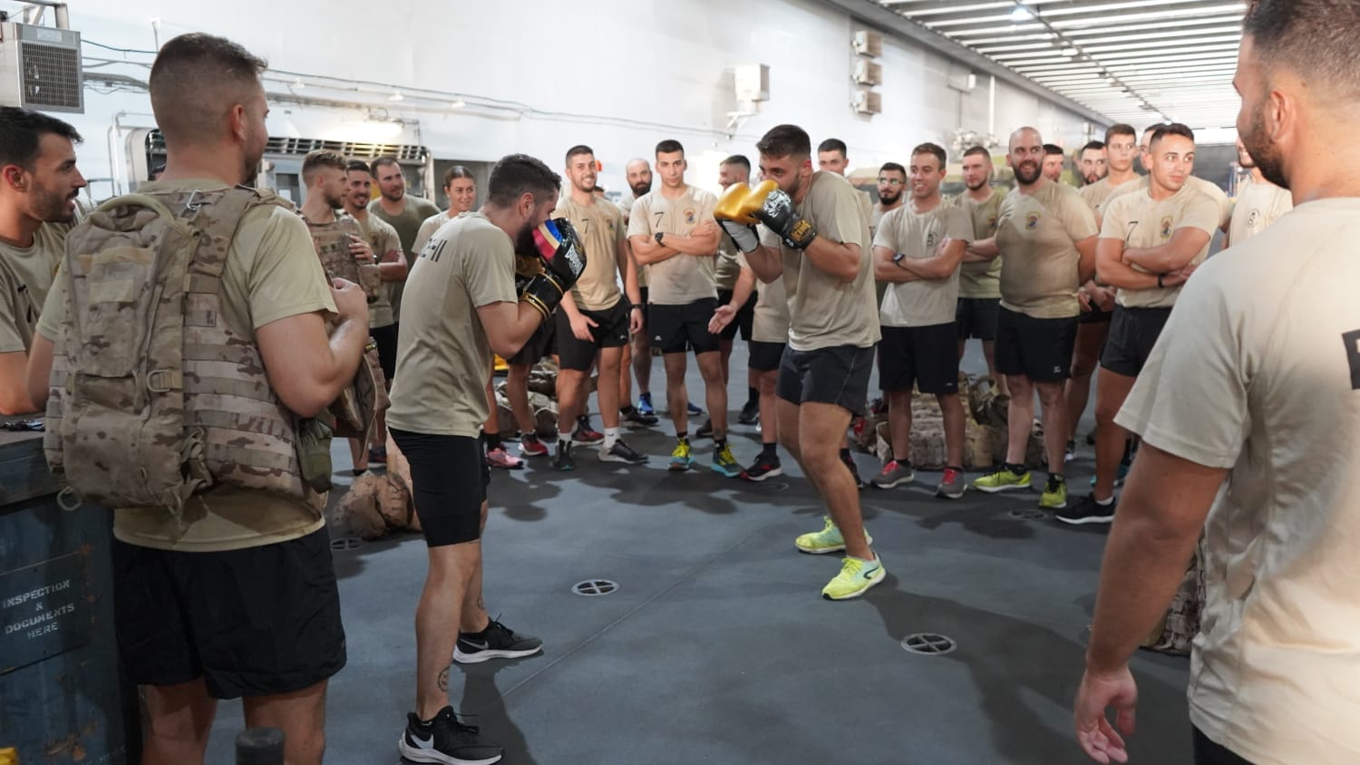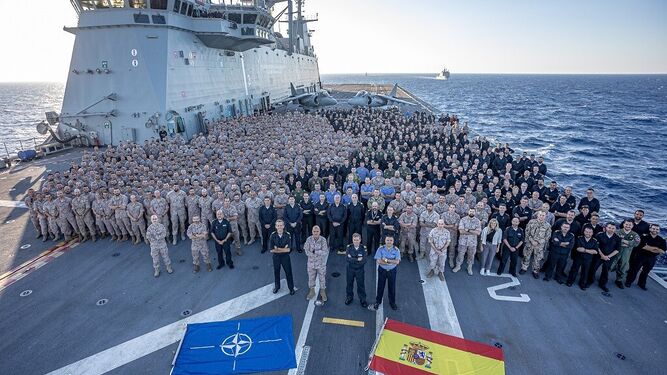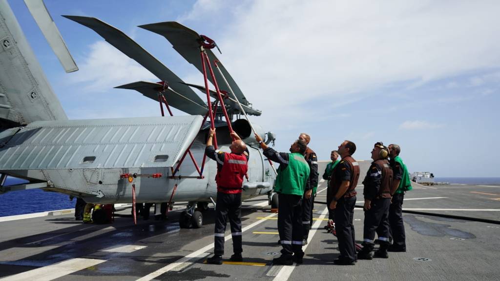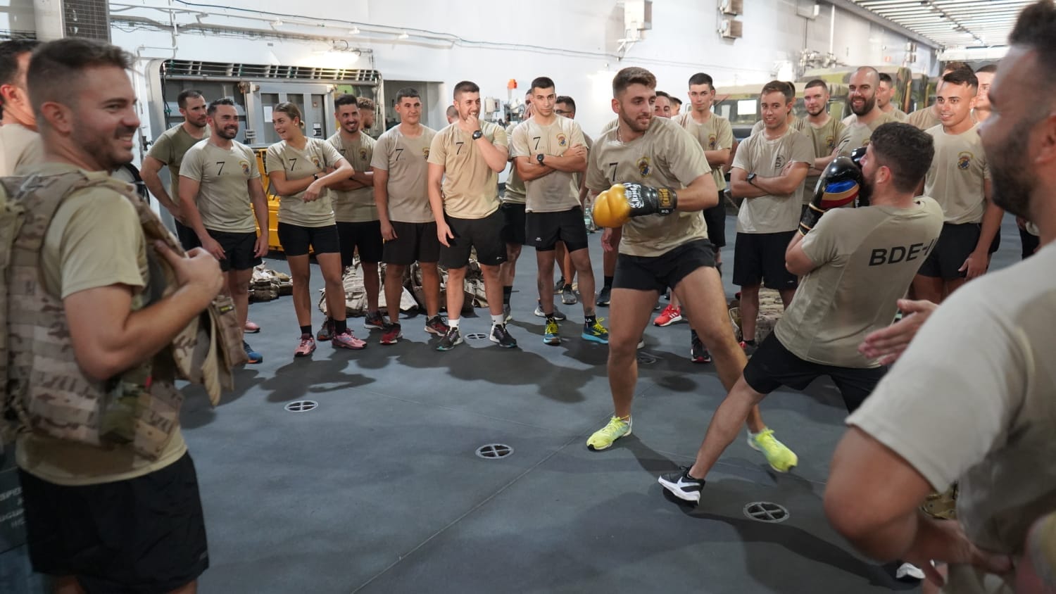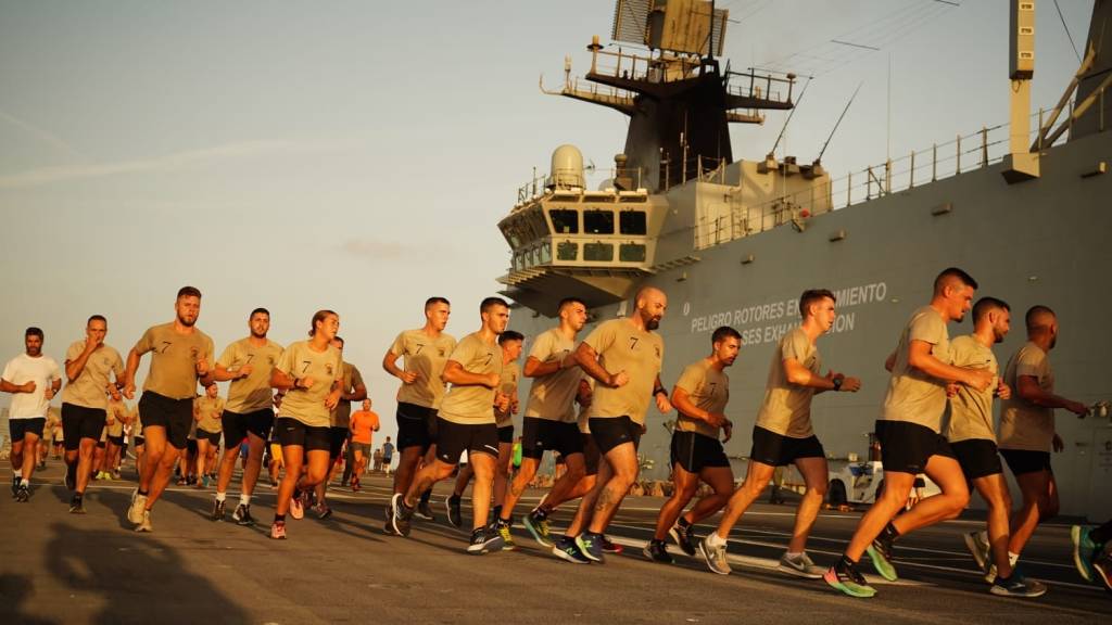 La dotación del LHD Juan Carlos I posa junto a los infantes de Marina del TEAR y mandos de la OTAN ocupando casi toda la cubierta de vuelo (FOTO: Armada)Cuando no se desarrollan operaciones aéreas, la cubierta de vuelo es aprovechada por los infantes de Marina para practicar sus ejercicios cotidianos (FOTO: Armada)Los infantes de Marina nunca descuidan su forma física (FOTO: Armada)Algunos pilotos de la FLOAN y dotación del Juan Carlos I se sumaron al entrenamiento del TEAR (FOTO: Armada)El boxeo sigue siendo una tradición deportiva en la Infantería de Marina (FOTO: Armada)El boxeo ayuda a mejorar los reflejos en el entrenamiento (FOTO: Armada)Personal de la FLOAN antiende a un Harrier. Echar agua a la turbina sirve para aumentar la potencia del motor Roll Royce Pegasus (FOTO: Armada)Los armeros se disponen a municionar un Harrier para una mision CAS (FOTO: Armada)La munición es transportada con seguridad por los armeros hasta los Harrier (FOTO: Armada)Tres Harrier se situan sobre el «Train-Line» de la cubierta de vuelo (FOTO: Armada)Harrier trincado en la cubierta de vuelo del Juan Carlos I. Por detras la fragata Navarra actuando de escolta (FOTO: Armada)Las RHIB Duarry Supercat esperan junto al Juan Carlos I (FOTO: Armada)Personal del Servicio de Vuelo y de la FLOAN se disponen a desplegar el rotor de un SH60F Oceanhawk (FOTO: Armada)El plegado del rotor principal permite que el helicóptero ocupe menos espacio en el hangar (FOTO: Armada)De ser necesario, la cola del helicoptero también se puede llegar a plegar, reduciendo así su volumén (FOTO: Armada)Pilotos de la FLOAN realizan la inspección de prevuelo de su helicoptero SH-60F Oceanhawk (FOTO: Armada)La puesta del sol no interrumpió las operaciones de vuelo (FOTO: Armada)Personal del Servicio de vuelo se dispone a colocar los calzos y las trincas en un helicóptero tras tomar en la cubierta de vuelo (FOTO: Armada)Los bomberos observan… siempre atentos (FOTO: Armada)En el «Tren Amarillo» hay toda clase de vehículos específicos para el sostenimiento de las operaciones aéreas a bordo del LHD Juan Carlos I, como este EINSA de contención anti-incendios (FOTO: Armada)Los bomberos ocupan su puesto es espera por si fuera necesaeia su intervención (FOTO: Armada)La seguridad en las operaciones en la cubierta de vuelo resulta vital. Vehículo del «Tren Amarillo» de lucha anti-incendios (FOTO: Armada)Un Harrier se dispone a tomar verticalmente sobre la cubierta de vuelo bajo la atenta mirada del personal del Servicio de Vuelo (FOTO: Armada)Simulacro de incendio en la cubierta de vuelo (FOTO: Armada)Personal del Servicio de Vuelo organizando la faena (FOTO: Armada)Tras el simulacro de incendio se retira todo el material de la cubierta de vuelo (FOTO: Armada)Personal del Servicio de Vuelo se mueven sobre la cubierta con los llamativos trajes anti-exposición de alta visibilidad (FOTO: Armada)Un Harrier se prepara para despegar desde el LHD Juan Carlos I(FOTO: Armada)Aviones Harrier trincados en la cubierta de vuelo (FOTO: Armada)Un Harrier se dispone a tomar verticálmente sobre la cubierta de vuelo del buque Juan Carlos I (FOTO: Armada)Vista desde el LHD Juan Carlos I de las lanchas LCM-1E partiendo hacia la costa turca (FOTO: Armada)Tres aviones Harrier trincados por detrás de la isla del LHD Juan Carlos I (FOTO: Armada)La dotación del LHD Juan Carlos I realiza un paseo FOD sobre la cubierta de vuelo para repasar que no haya ningún objeto que pueda suponer un peligro para las operaciones aéreas (FOTO: Armada)Paseo FOD (siglas de Foregn Object Damage) sobre la cubierta de vuelo. La seguridad se toma muy en serio (FOTO: Armada)La costa turca vista desde el Juan Carlos I (FOTO: Armada)La cubierta de vuelo del LHD Juan Carlos I dispone de balizamiento lumínico para ayudar a las operaciones de vuelo nocturnas (FOTO: Armada)Los infantes de Marina realizan un «Fast Roap» desde un SH-60F Oceanhawk (FOTO: Armada)Los helicópteros son una gran herramienta táctica para los infantes de Marina, al permitirles un despliegue rápido en sus asaltos anfibios verticales (FOTO: Armada)Unos armeros del LHD Juan Carlos I realizan el mantenimiento de una estación RWS Sentinel 2.0 de Escribano tras un ejercicio de tiro. Observar los casquillos sobre la cubierta (FOTO: Armada)Una señalero indica una posición durante un ejercicio (FOTO: Armada)Un infante de Marina practica un rápel por el hueco de un elevador del LHD Juan Carlos I durante el entrenamiento (FOTO: Armada)Los infantes de Marina se preparan antes de embarcar en las lanchas de desembarco LCM-1E (FOTO: Armada)Los infantes de Marina reembarcando de nuevo en el LHD Juan Carlos I (FOTO: Armada)Una lancha LCM-1E maniobra dentro del dique inundable del LPD Castilla (FOTO: Armada)Una lancha LCM-1E parte desde el dique inundable del LPD Juan Carlos I con dos camiones de 6 tn del TEAR (FOTO: Armada)La pluma de babor del LPD Castilla se dispone a botar una RHIB Duarry Supercar de asalto anfibio (FOTO: Armada)Los «Dragones del Viento» cabalgando sobre las olas a bordo de sus monturas Duarry Supercat (FOTO: Armada)Infantes de Marina abordando una RHIB Duarry Supercat de asalto anfibio (FOTO: Armada)Una lancha de desembarco LCM-1E se dispone a arribar al rebalaje de una playa turca portando dos VCI Piraña IIIC (FOTO: Armada)Las siempre eficaces LCM-1E del Grupo Naval de Playa volvieron a demostrar una vez más su alta capacidad de trabajo en operaciones anfibias (FOTO: Armada)Una lancha LCM-1E se aproxima a la playa con un vehiculo de combate de infantería Piraña IIIC (FOTO: Armada)Una lancha LCM-1E deposita sobre la playa de Doganbey un camión Iveco-Pegaso 6×6 del Tercio de Armada (FOTO: Armada)Vehículos Iveco-Pegaso y Uro VAMTAC de la Infantería de Marina en la playa turca de Doganbey (FOTO: Armada)Dos lanchas LCM-1E transportan de vuelta varios vehículos del TEAR a su buque nodriza (FOTO: Armada)Los LPD Castilla y FFG Navarra vistos desde el LHD Juan Carlos I (FOTO: Arma