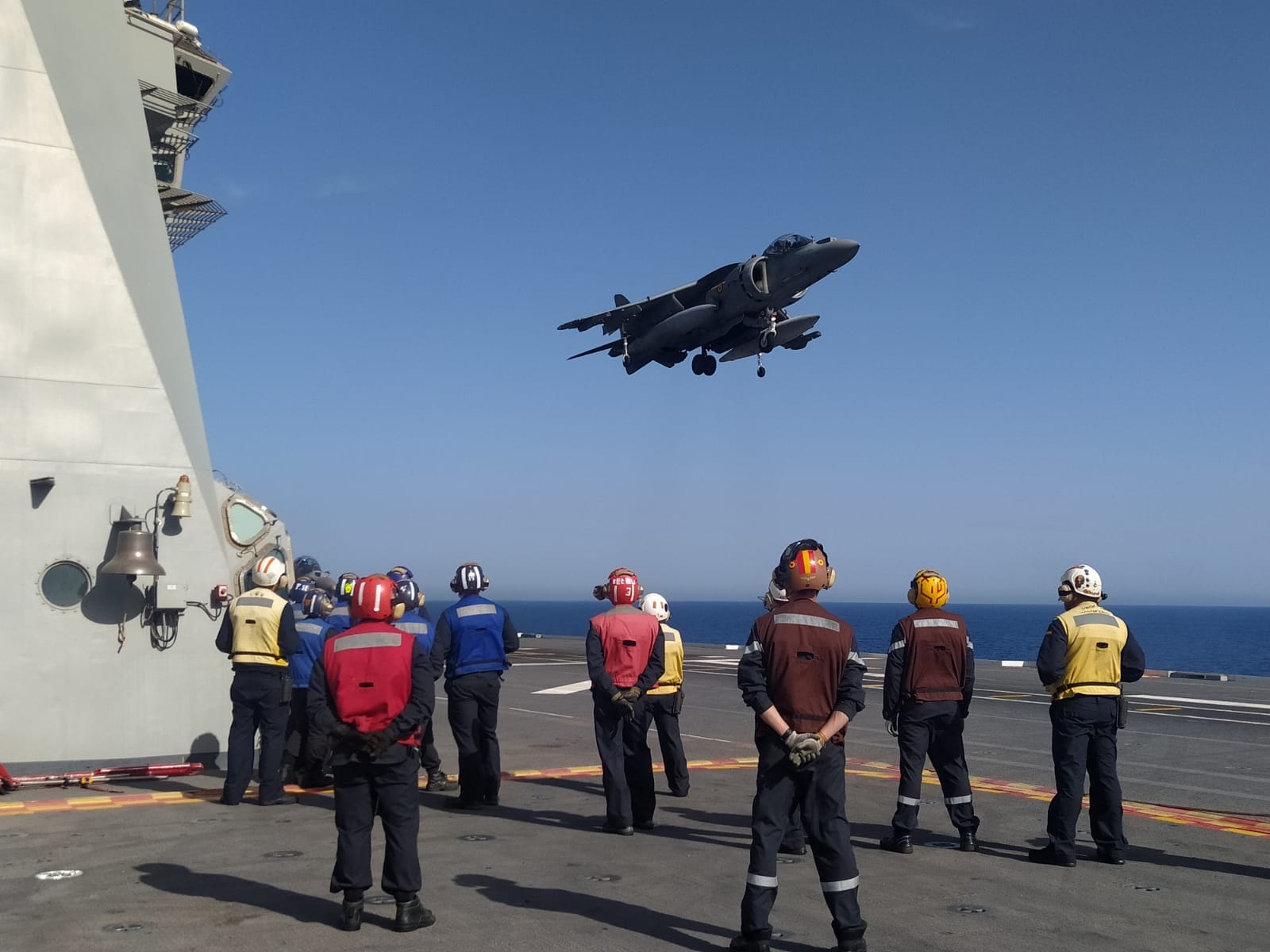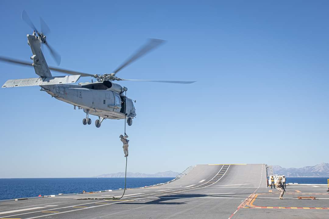 Para finalizar cabe destacar que, tras completar el ejercicio Dynamic Mariner 22 / Mavi Balina 2022, en el cual el Grupo Anfibio y de Proyección de la Flota se ha certificado como Mando de la Fuerza Anfibia de Respuesta de la OTAN para el año 2023, el Buque de Proyección Estratégica Juan Carlos I (L-61) el Buque de Asalto Anfibio Castilla (L-52) y la fragata Navarra (F-85), se integraron durante tres días con el 10º Grupo de Combate de la Marina de los Estados Unidos (Carrier Strike Group 10) desplegado en el Mediterráneo, interactuado las unidades españolas con el portaaviones USS George H.W. Bush (CVN-77) de la US Navy durante dicho periodo y realizando sus aviones F/A-18 E/F/G y E-2D ejercicios conjuntos con los AV-8B+ de la FLOAN, en especial en misiones conjuntas de apoyo cercano (CAS) y protección de la Flota (CAP) demostrando así, una vez más, la buena interoperatividad y las excelentes relaciones y confianza mutua entre ambas armadas aliadas. De hecho esta es la segunda vez que el buque insignia español se integra en un Grupo de combate estadounidense. Igualmente los AV8B+ Harrier II españoles se han adiestrado también junto a cazas F-16C Viper y F-4E Phantom II de la Fuerza Aérea de Grecia durante el tránsito por sus aguas.