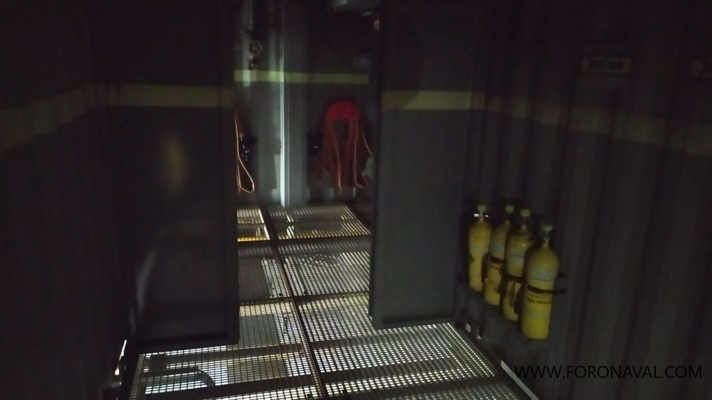 El simulador de mayor tamaño, al que tuvimos la suerte de acceder, representa en su interior todos los espacios, cubiertas, cámaras, pañoles, sollados, galerías, pasillos y compartimentos que pueden tener cualquier buque de tipo militar, centrándose especialmente en los lugares que pueden originar un fuego, como por ejemplo la cocina. Desde aquí, los marinos que se someten al adiestramiento deben vestirse con los equipos de protección individual (traje ignífugo, equipos autónomos de respiración tipo Armada, casco de protección tipo bombero, etc.) y acceder a los espacios afectados por el fuego para tratar de contenerlo y extinguirlo, recreando las condiciones de calor, humo y baja visibilidad propios de un incendio de manera controlada y segura para ayudar al buen entrenamiento de los marinos ante esta situación.