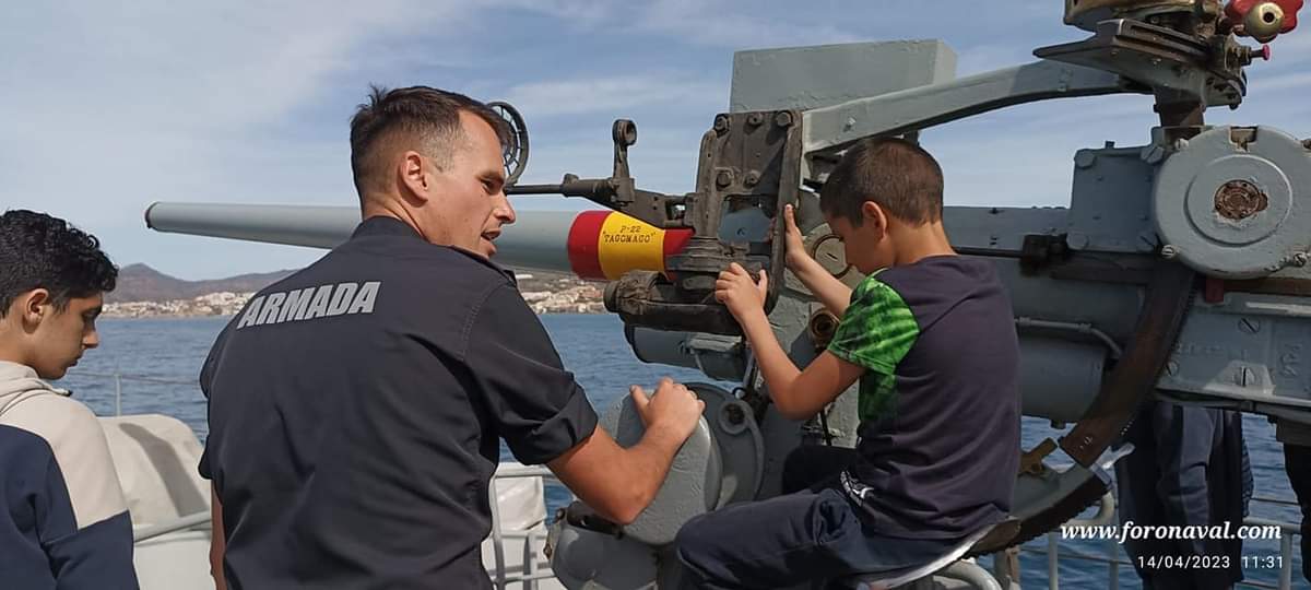 Un miembro de la dotación del Tagomago mostrando a un jóven invitado el manejo del montaje artillero MK-22 de 76 mm. (FOTO: Foro Naval)