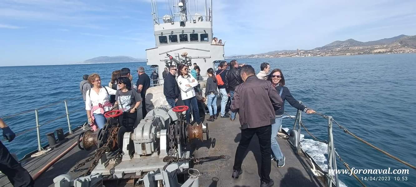 Nuestros compañeros de Foro Naval en el alerón del Tagomago disfrutando de la travesía por la Bahía de Málaga (FOTO: Foro Naval)