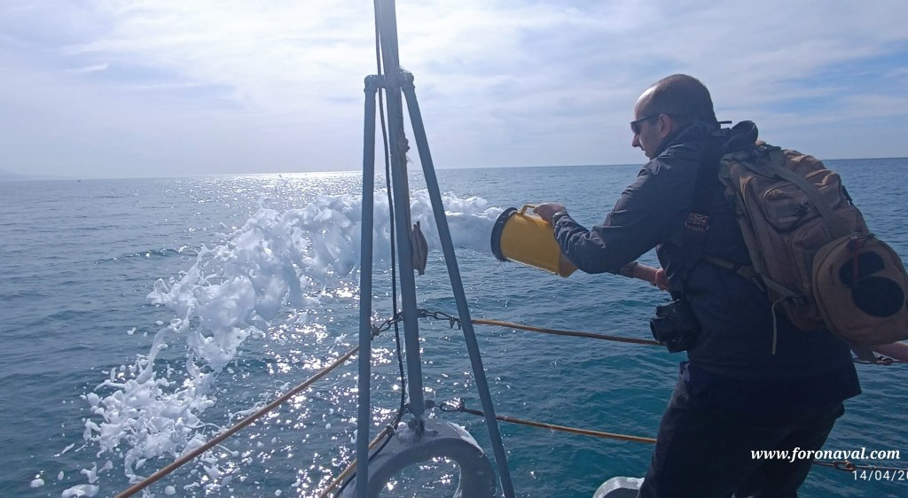 Uno de los invitados de Foro Naval probando la manguera de extinción anti-incendios del Tagomago: (FOTO: Foro Naval)