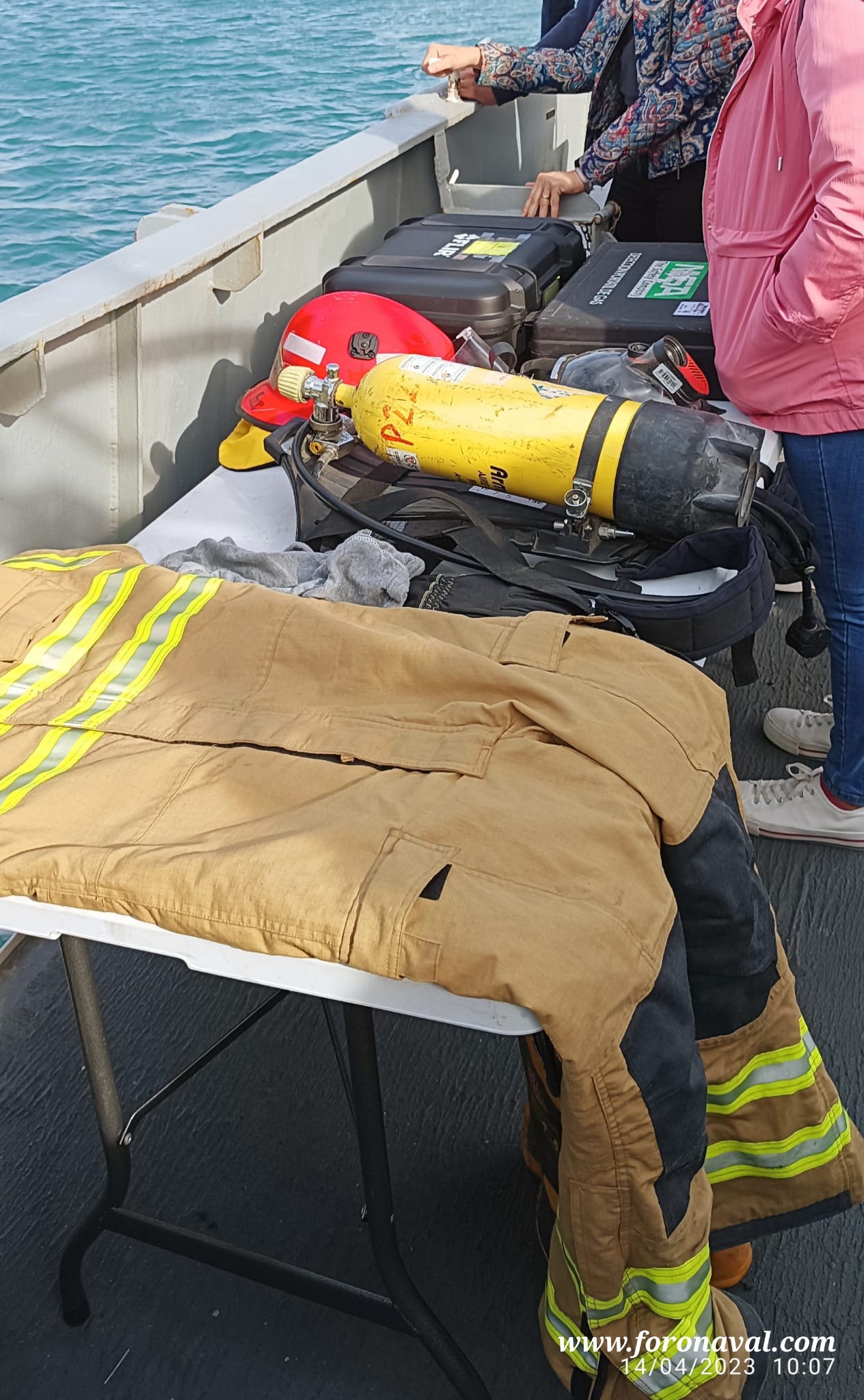Exposición de los equipos anti-incendios del Tagomago, destacando el mono ignifugo y la botella de aire para la máscara del equipo de respiración autónoma del tipo Armada, empleada por el equipo de Control de Daños del buque (FOTO: Foro Naval)