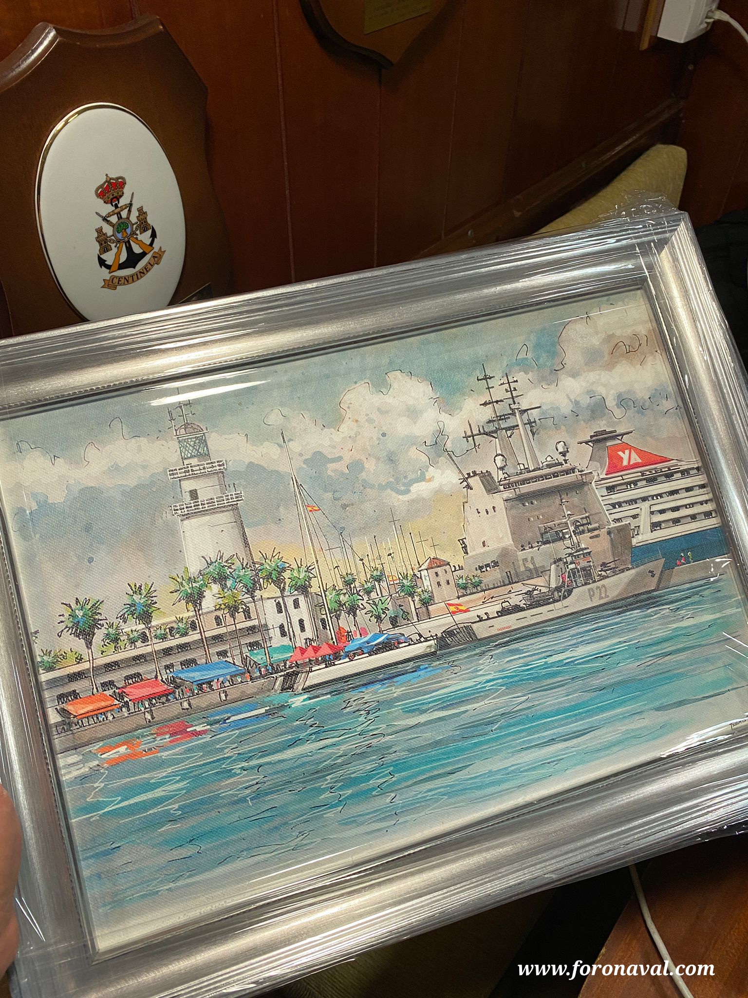 Uno de los cuadros dibujados por el artista Txema Prada que hay colgados en los mamparos de las cámaras del patrullero Tagomago, aquí mostrando al buque en su base del Puerto de Málaga (FOTO: Foro Naval)