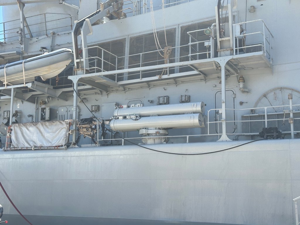 En la cubierta principal hay dos montajes triples de tubos lanzatorpedos Mk32 para torpedos Mk46 Mod5, uno por banda