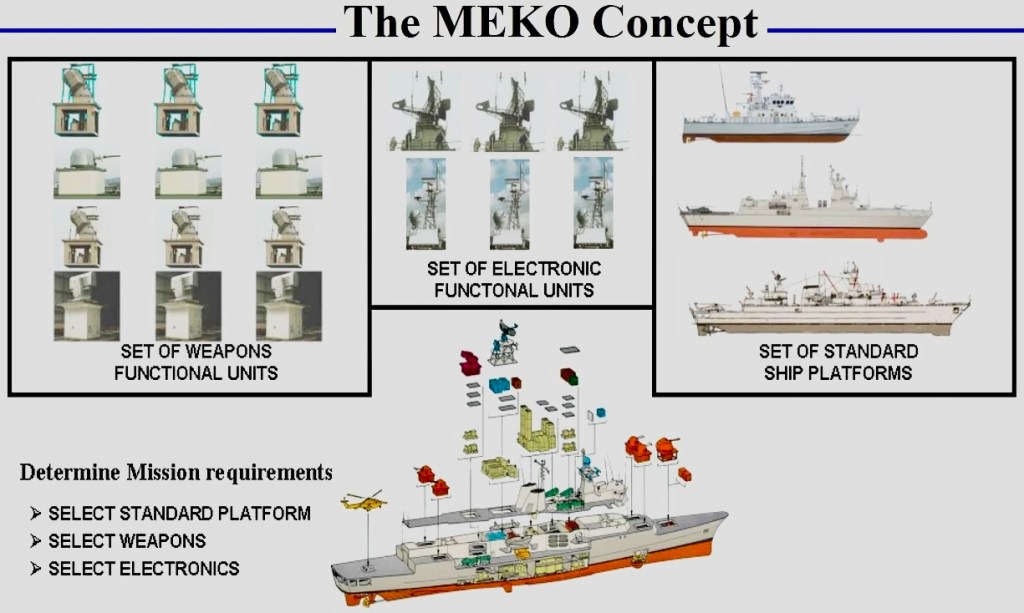 MEKO es el acrónimo de Mehrzweck-Kombination (combinación polivalente) y el sistema se caracteriza por el empleo de módulos estandarizados que pueden ser montados y desmontados de manera sencilla y utilizan conexiones eléctricas, hidráulicas o de aire comprimido comunes. Cada cliente potencial puede elegir una combinación de sistemas de armas, electrónica y tamaño adaptado a sus necesidades. Dado que se utilizan componentes similares en la construcción, los buques pueden ser ofrecidos a unos precios menores, pudiendo en teoría ser modernizados también de una forma más simple y económica que un diseño convencional.