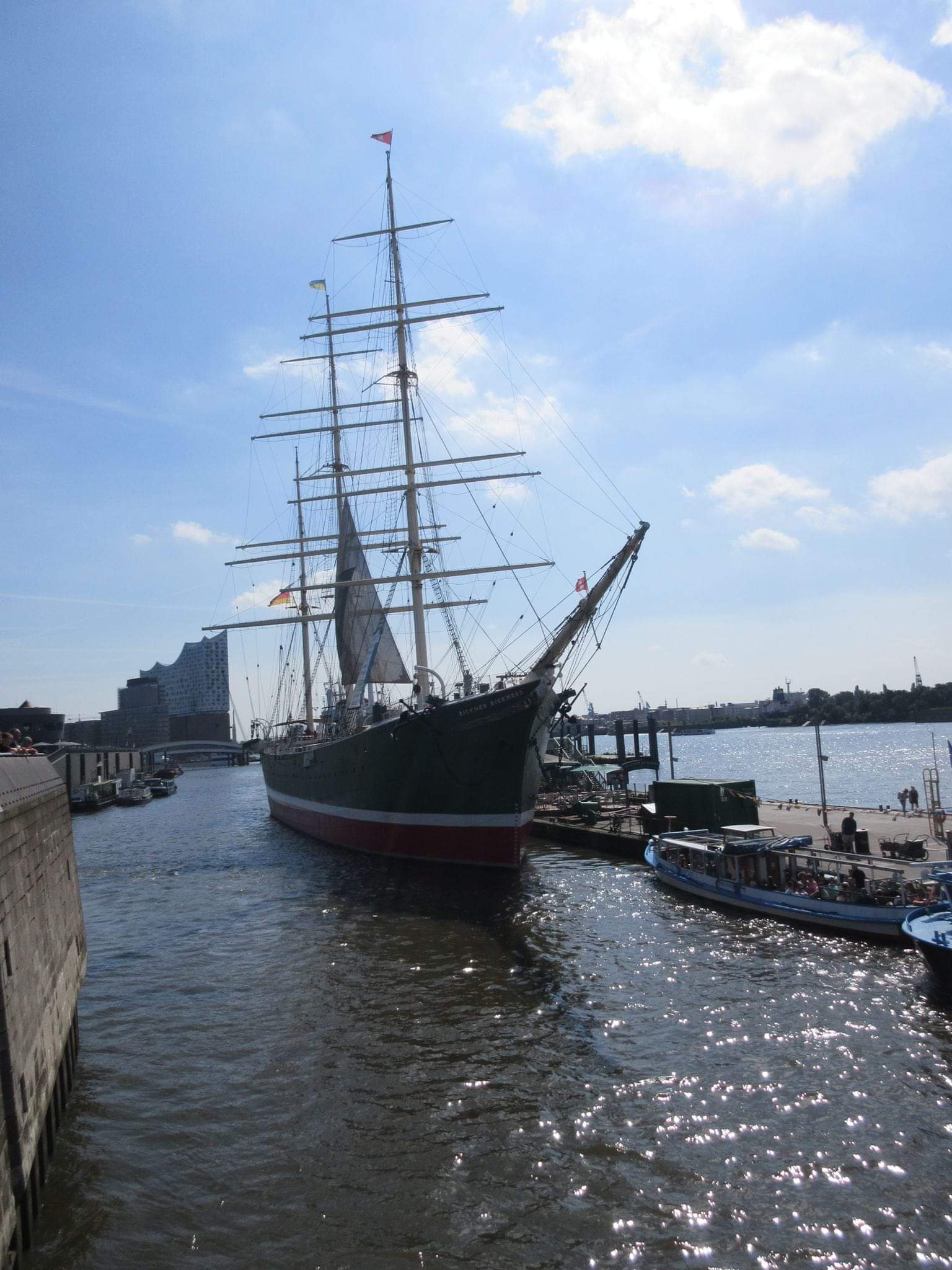 El buque mercante Rickmer Rickmers, nombrado así como homenaje al nieto del fundador de la compañía naviera y que está representado en su mascarón de proa, fue construido en 1896 por el astillero Rickmers de Bremerhaven en una época en la que la vela aún podía competir con la propulsión mecánica de manera rentable, siendo utilizado por primera vez en la ruta de Hong Kong transportando arroz y bambú. En 1912 fue comprado por el empresario alemán Carl Christian Krabbenhöft, rebautizándolo como Max y destinándolo a la ruta comercial entre Hamburgo y Chile para el transporte de nitratos, muy necesarios para abonar los campos de cultivos centroeuropeos de esos años.