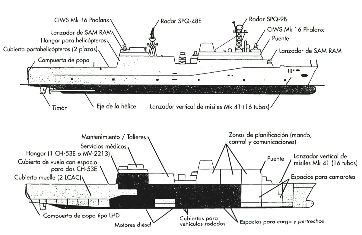 Pensados para operar a unos 45 kilómetros de distancia de la costa, esta clase de buques pueden proyectar desde la mar hacia tierra a unos 700 infantes de Marina mediante vehículos blindados anfibios AAV-7, de colchón de aire LCAC y convertiplanos MV-22B Osprey, pudiendo dar covertura aérea con los helicópteros de ataque AH-1Z Viper y los drones UCAV que pueden llevar a bordo, teniendo con ello la capacidad de actuar casi en solitario y fuera de un ARG (Grupo Anfibio de Intervención, compuesto por un conjunto de buques del tipo LHA, LHD y LPD) ante escenarios limitados.